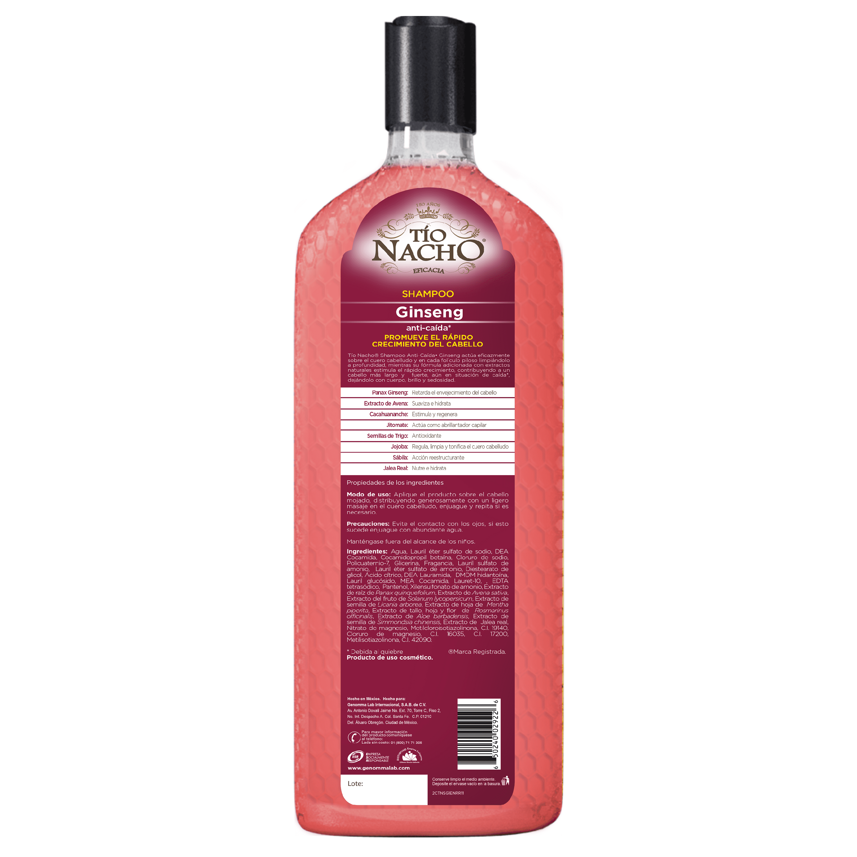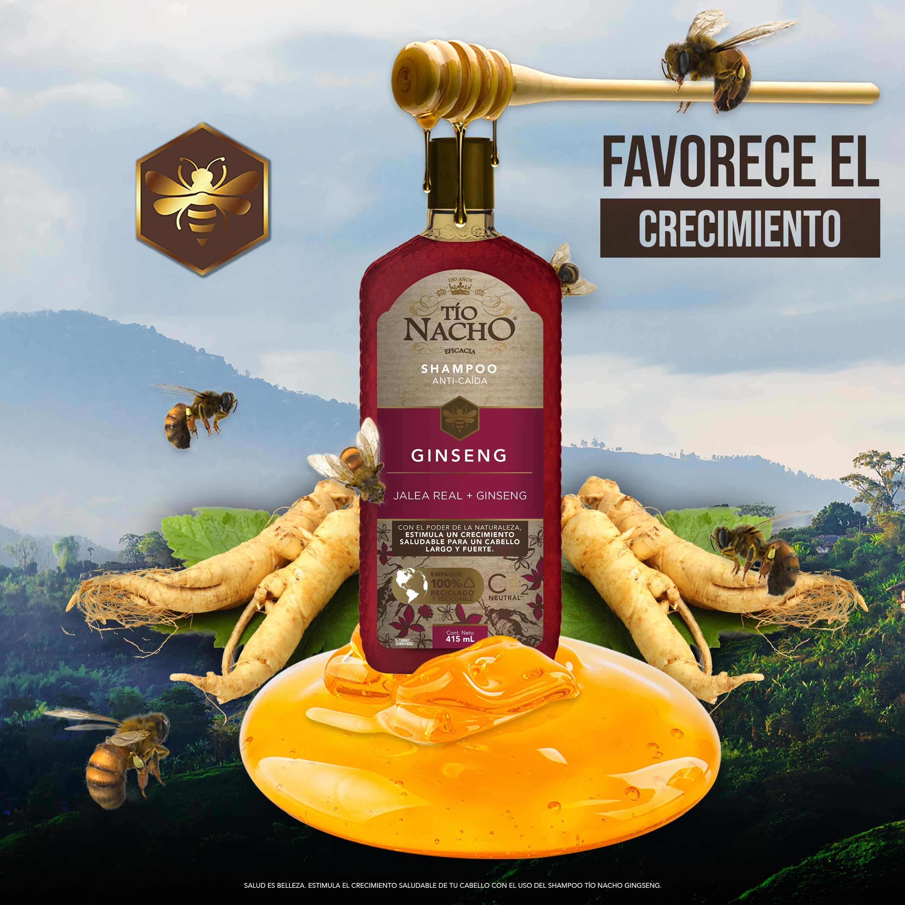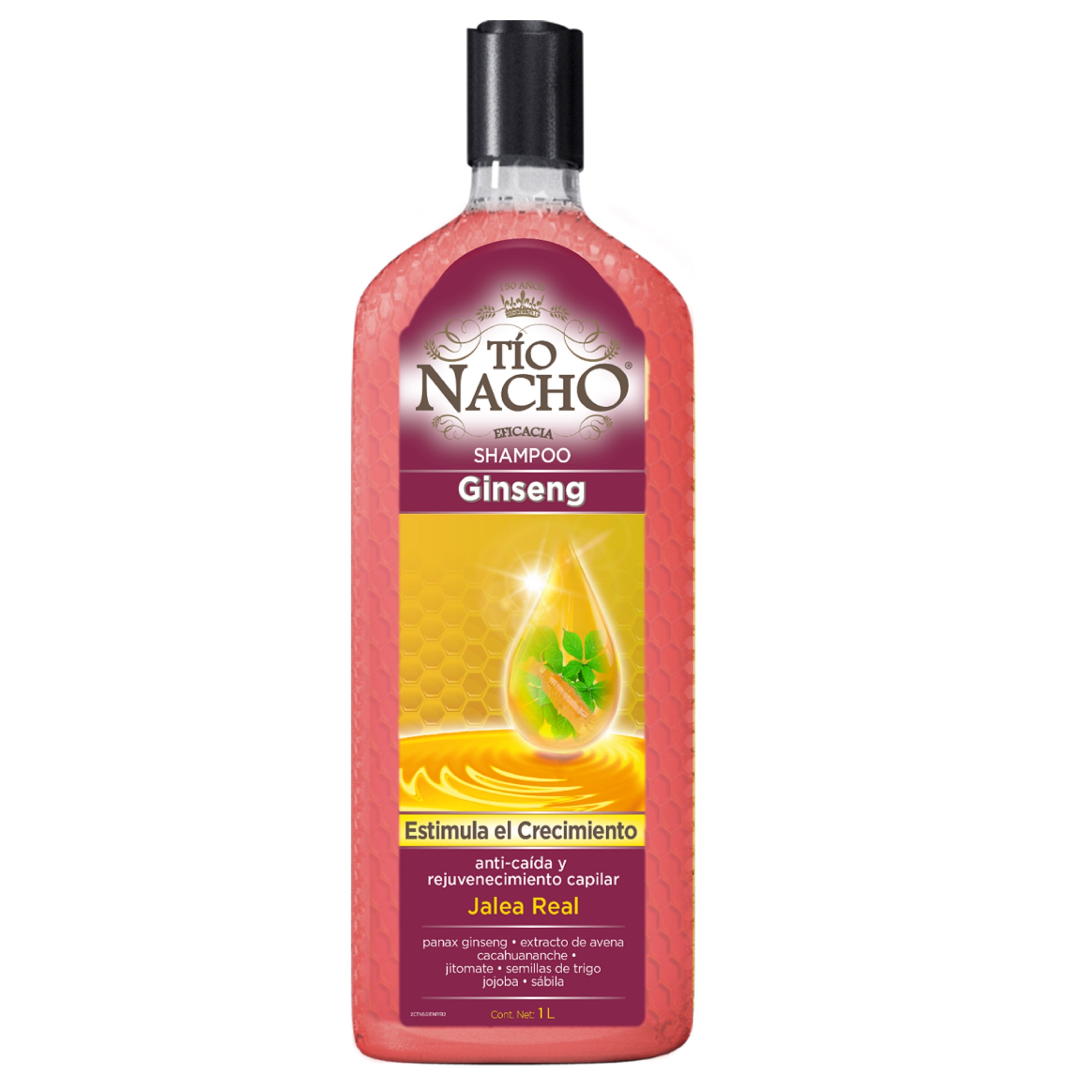Tío Nacho renueva su imagen para brindarte un Cabello y Planeta más saludable. Tío Nacho ANTICAÍDA GINSENG revitaliza la fibra capilar para un CRECIMIENTO saludable, un cabello más LARGO y FUERTE, aún en situación de caída por quiebre, dejándolo con cuerpo y sedosidad. Actúa eficazmente sobre el cuero cabelludo y fibra capilar mientras su fórmula con JALEA REAL, adicionada con extractos de origen natural como GINSENG, ALOE VERA, ROMERO y JOJOBA estimulando el crecimiento saludable. Nuevo empaque 100% reciclado y reciclable.