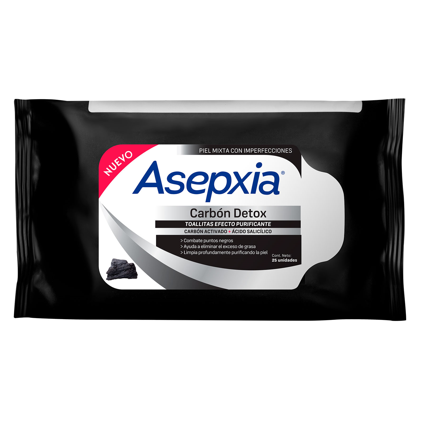 Las TOALLITAS de limpieza facial Carbón Detox limpian profundamente PURIFICAN la piel, ayudan a eliminar el exceso de GRASA y combaten PUNTOS NEGROS y GRANITOS. El carbón es un mineral de origen 100% natural que es conocido por su increíble capacidad de absorber, en sus miles de microporos, la suciedad, grasitud e impurezas, provocadas por la contaminación y suciedad del ambiente. Las Toallitas Asepxia de limpieza facial Carbón Detox limpian profundamente purificando la piel, ayudan a eliminar el exceso de grasa, dejando tu piel limpia, matificada y suave. Combínalas con todo el set de Asepxia Carbón para obtener mejores resultados.