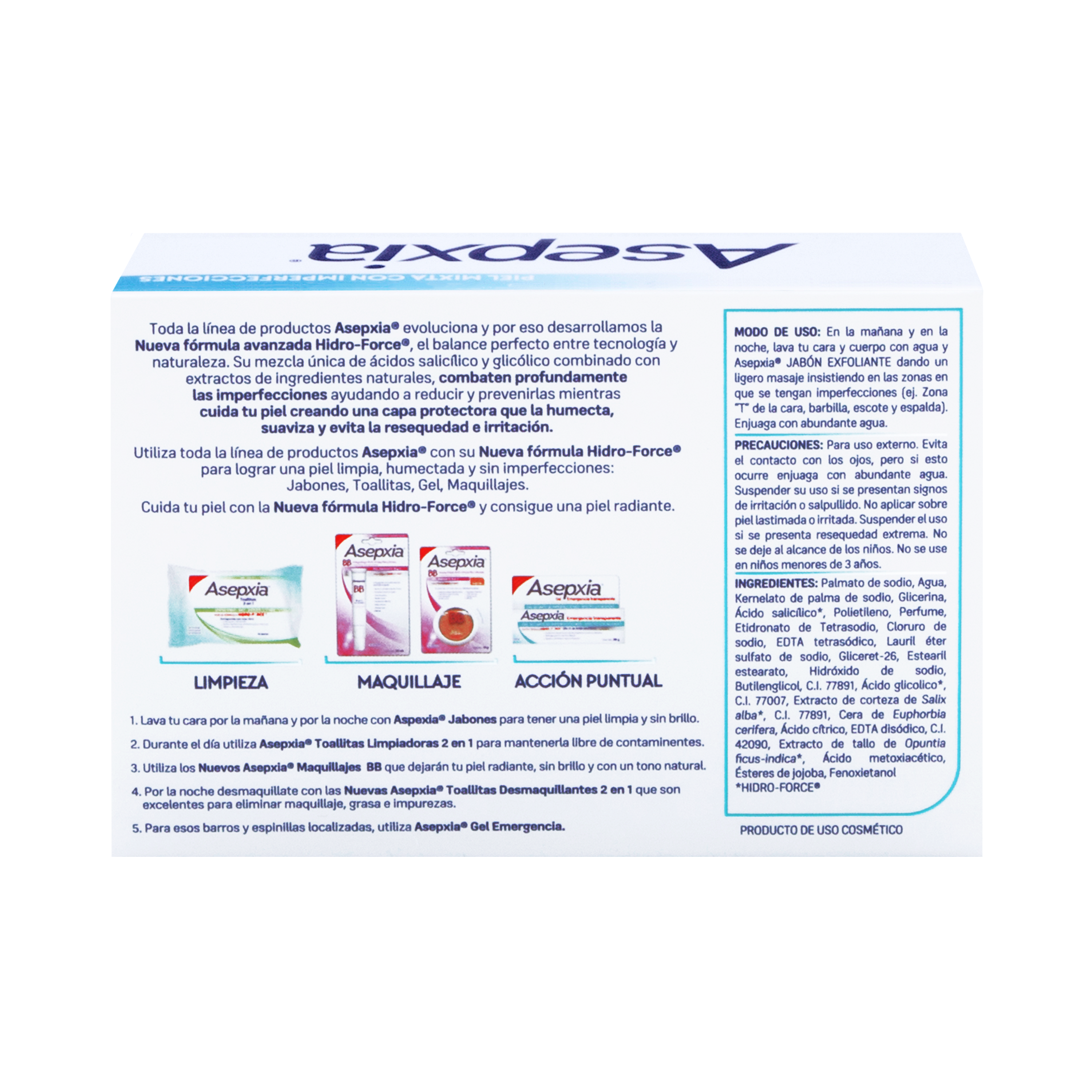 Además cuida tu piel creando una capa protectora que la HUMECTA, suaviza y evita la resequedad e irritación. Utiliza toda la línea de productos Asepxia con su nueva fórmula Hidro-force para lograr una piel limpia, humectada y sin imperfecciones.
