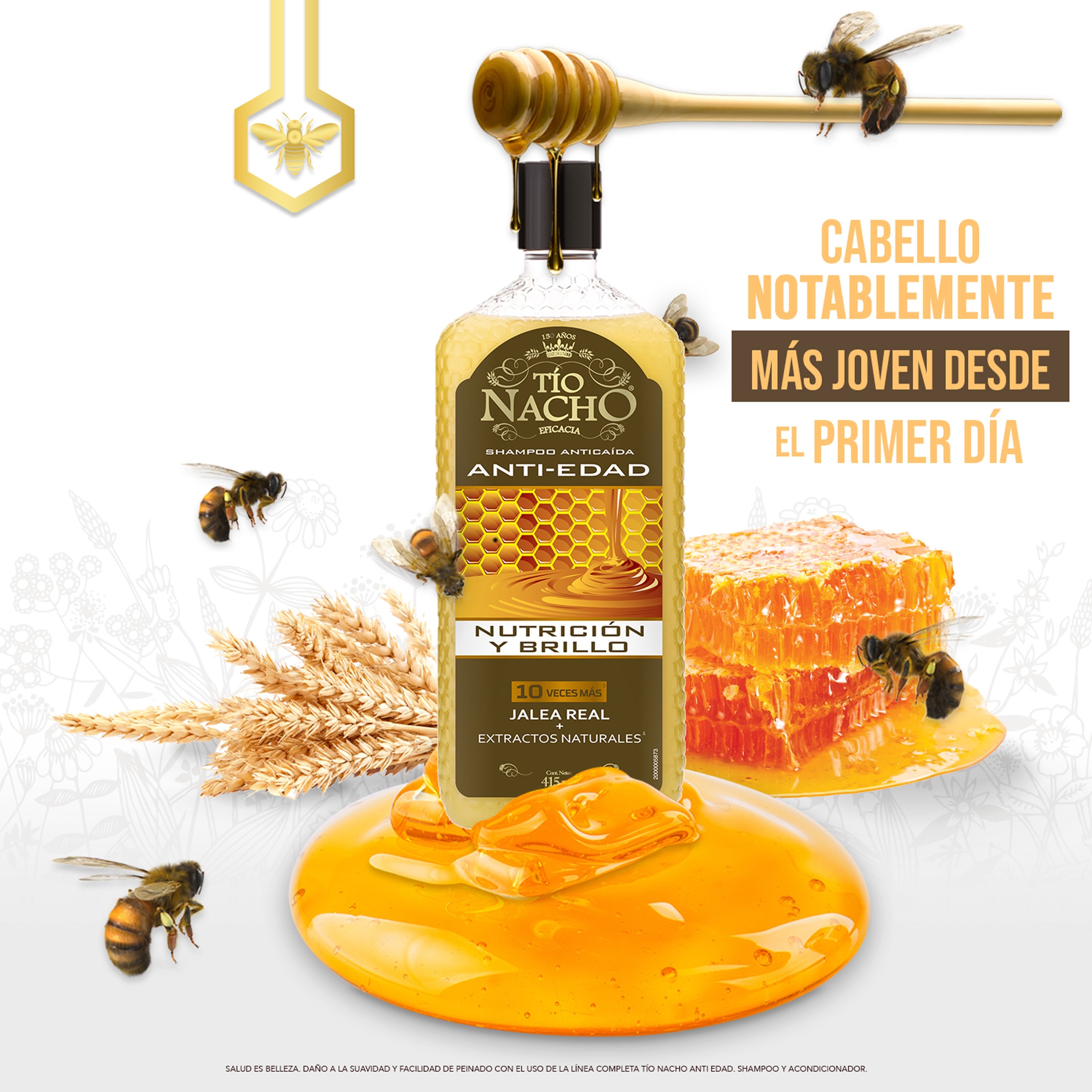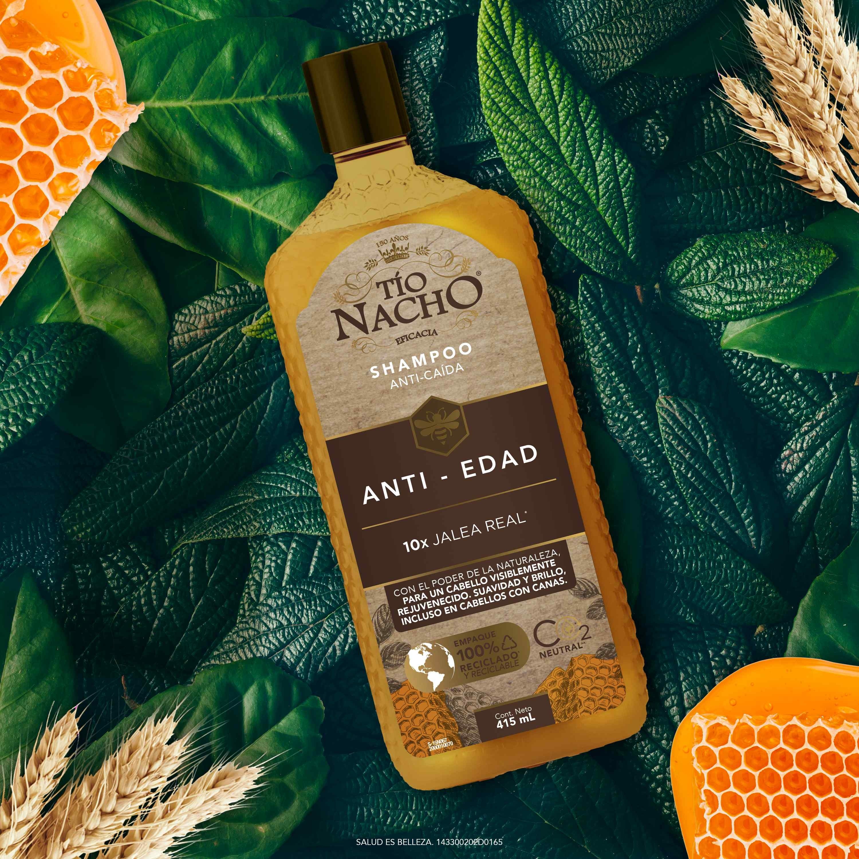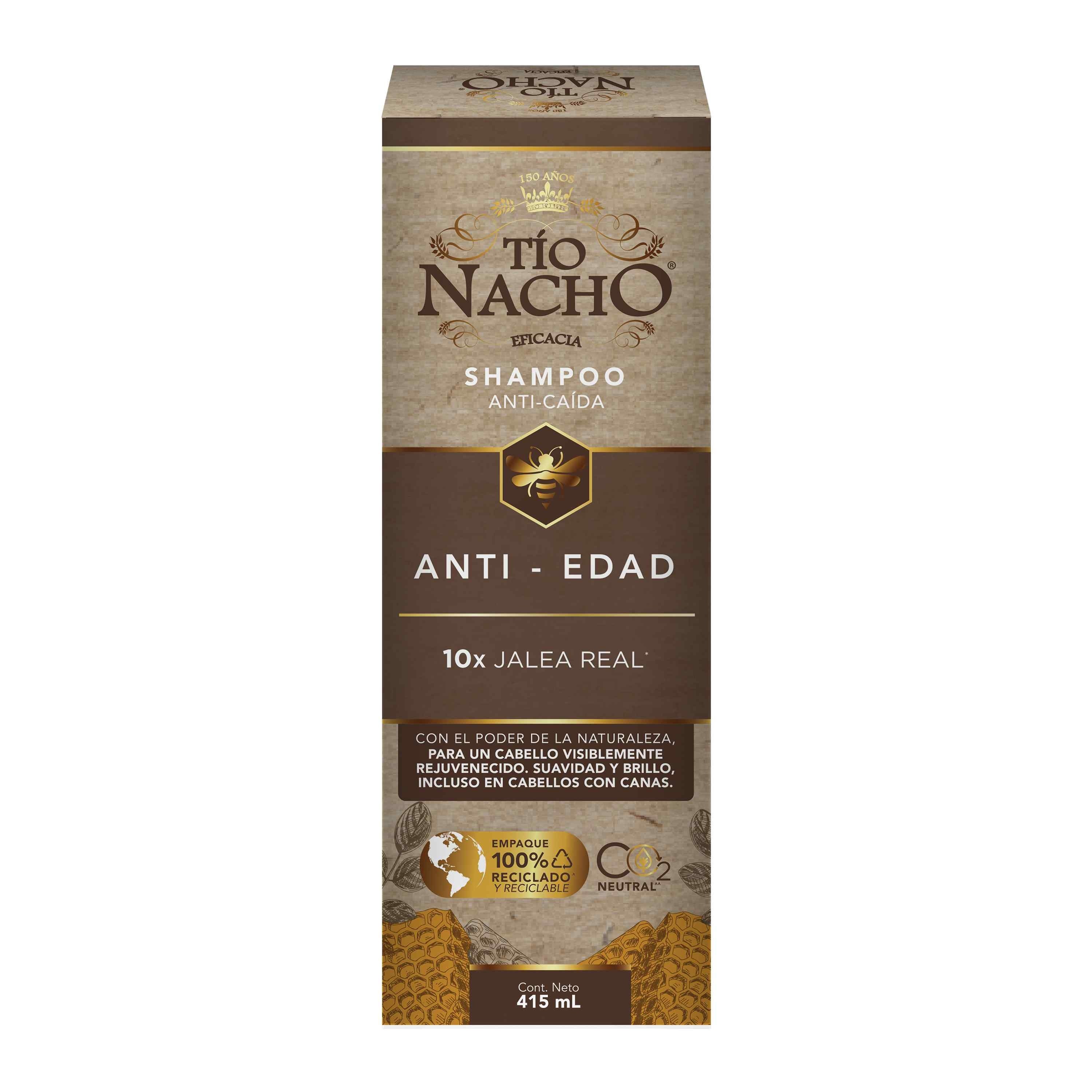 Tío Nacho renueva su imagen para brindarte un Cabello y Planeta más saludable. Prueba el poder del Shampoo TÍO NACHO ANTI-EDAD y dale a tu cabello una apariencia más joven, visiblemente más saludable y SUAVE. Con la eficacia del extracto de JALEA REAL y extractos de origen natural como ROMERO, BARDANA, ALOE VERA, JOJOBA. Nuevo empaque 100% reciclado y reciclable.