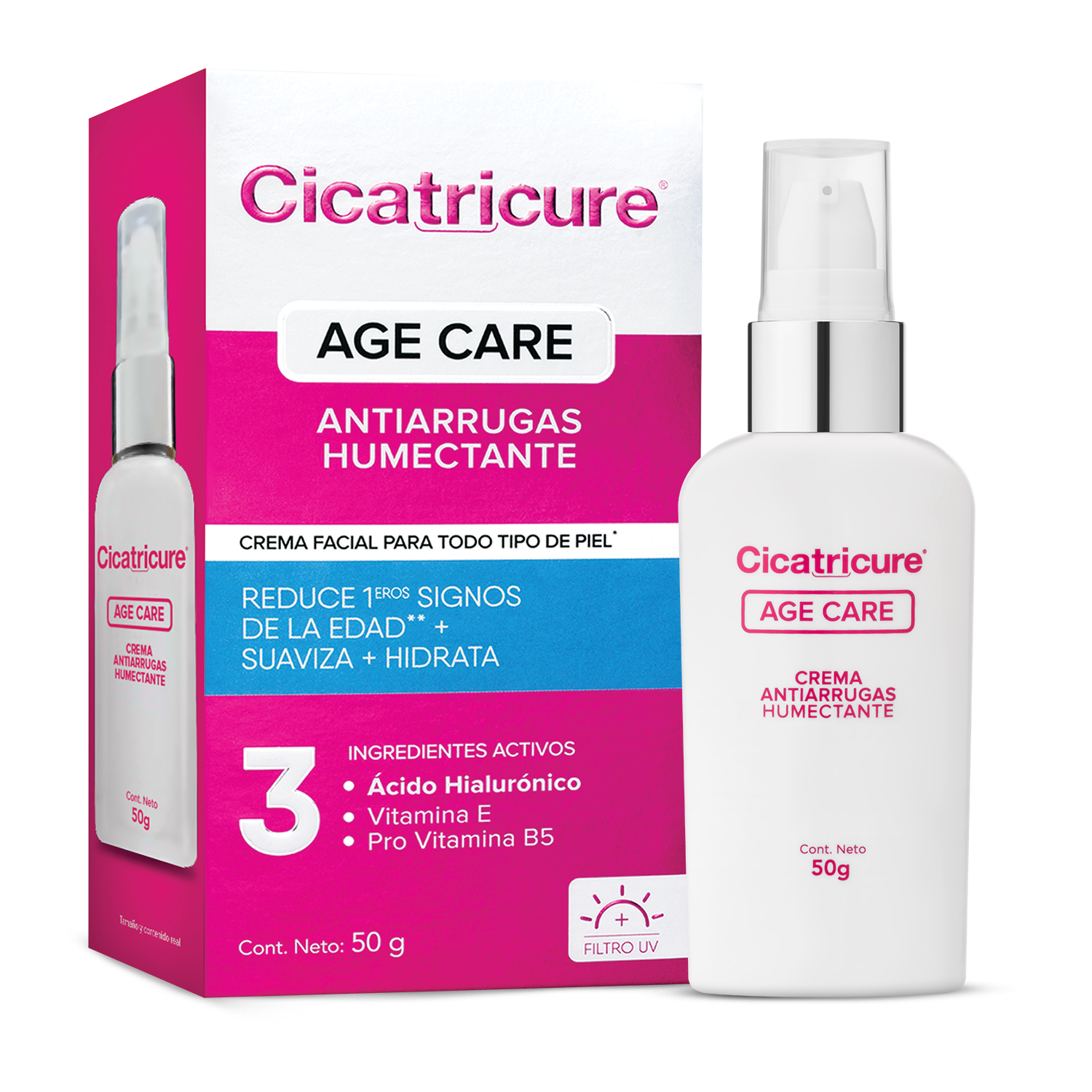Cicatricure Age Care Reafirmante es una CREMA FACIAL con COLÁGENO reduce la profundidad de las primeras arrugas, HIDRATA y aumenta la elasticidad mejorando la FIRMEZA de la piel. Además contiene FILTRO UV que ayudan a prevenir la formación temprana de nuevas arrugas. Contiene ingredientes: