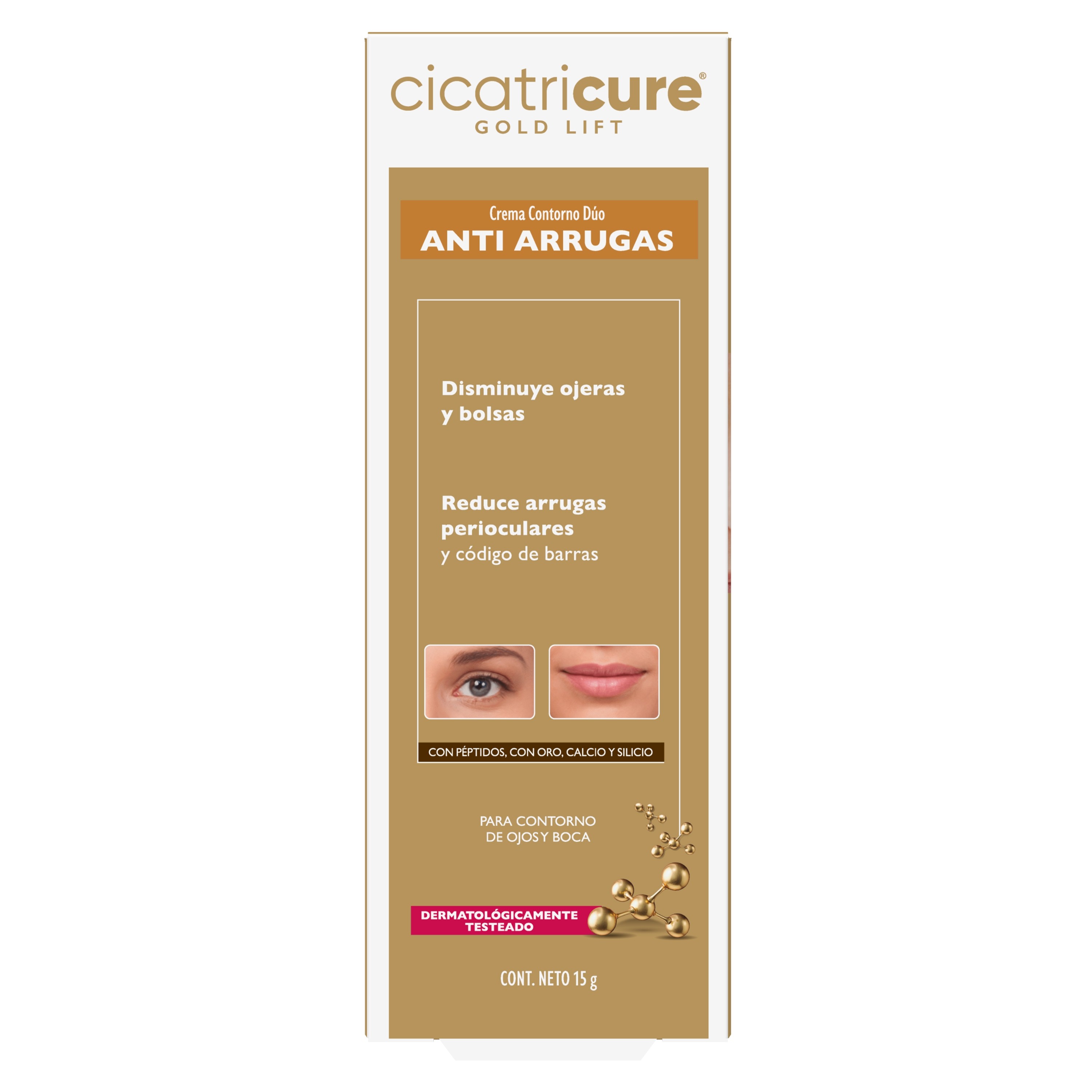 Cicatricure desarrolló la nueva línea Antiedad Gold Lift con una exclusiva fórmula que combina el poder de los Péptidos con Oro, Calcio y Silicio impactando en la morfología de la piel, los péptidos de oro son el ingrediente más innovador en ciencia dermocosmética para reducir el efecto de cara caída causado por los años y la gravedad. Cicatricure Gold Lift Duo es una crema que actúa REDUCIENDO la profundidad de las ARRUGAS GRAVITACIONALES, ARRUGAS PERIOCULARES y las conocidas CÓDIGO DE BARRA en solo 6 SEMANAS. Aplica en el contorno de OJOS Y BOCA para disminuir dúo disminuye OJERAS y BOLSAS, creando un efecto lifting. Dermatologicamente Testeado.