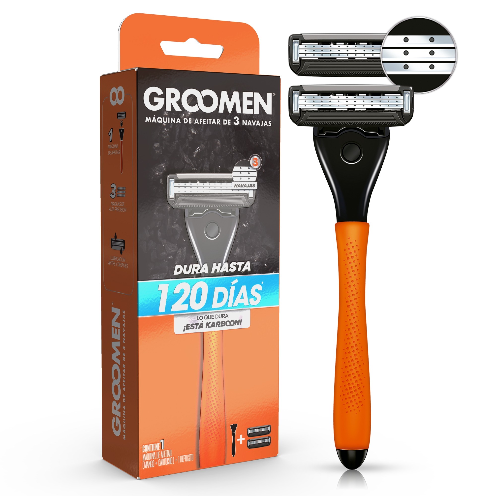 Rastrillo Groomen 300. Lo que dura ¡ESTA KARBOON! Cada cartucho tiene una duración GARANTIZADA de 30 DÍAS*, aunque a algunos usuarios les ha durado mucho más, HASTA 6 MESES de uso sin cambiar el cartucho. Tiene una DOBLE LUBRICACIÓN que ayuda a evitar la irritación en el momento de la rasurada, con una banda superior con CARBÓN ACTIVADO y una banda inferior con VITAMINA E y ALOE . Fabricado con 3 cuchillas de acero con NANOTECNOLOGÍA CERÁMICA y una navaja posterior de ALTA PRECISIÓN para un perfilado perfecto. Su mango antideslizante reforzado con goma, es reutilizable e intercambiable con cualquier otro cartucho GROOMEN. [MODO DE USO] Hidrata tu piel para un deslice con mayor facilidad, puede utilizarse con o sin espuma. Aféitate con movimientos ligeros en sentido del crecimiento del la barba o viceversa o según la dirección en la que sientas más confortable *Con un uso promedio de 3.4 veces por semana.