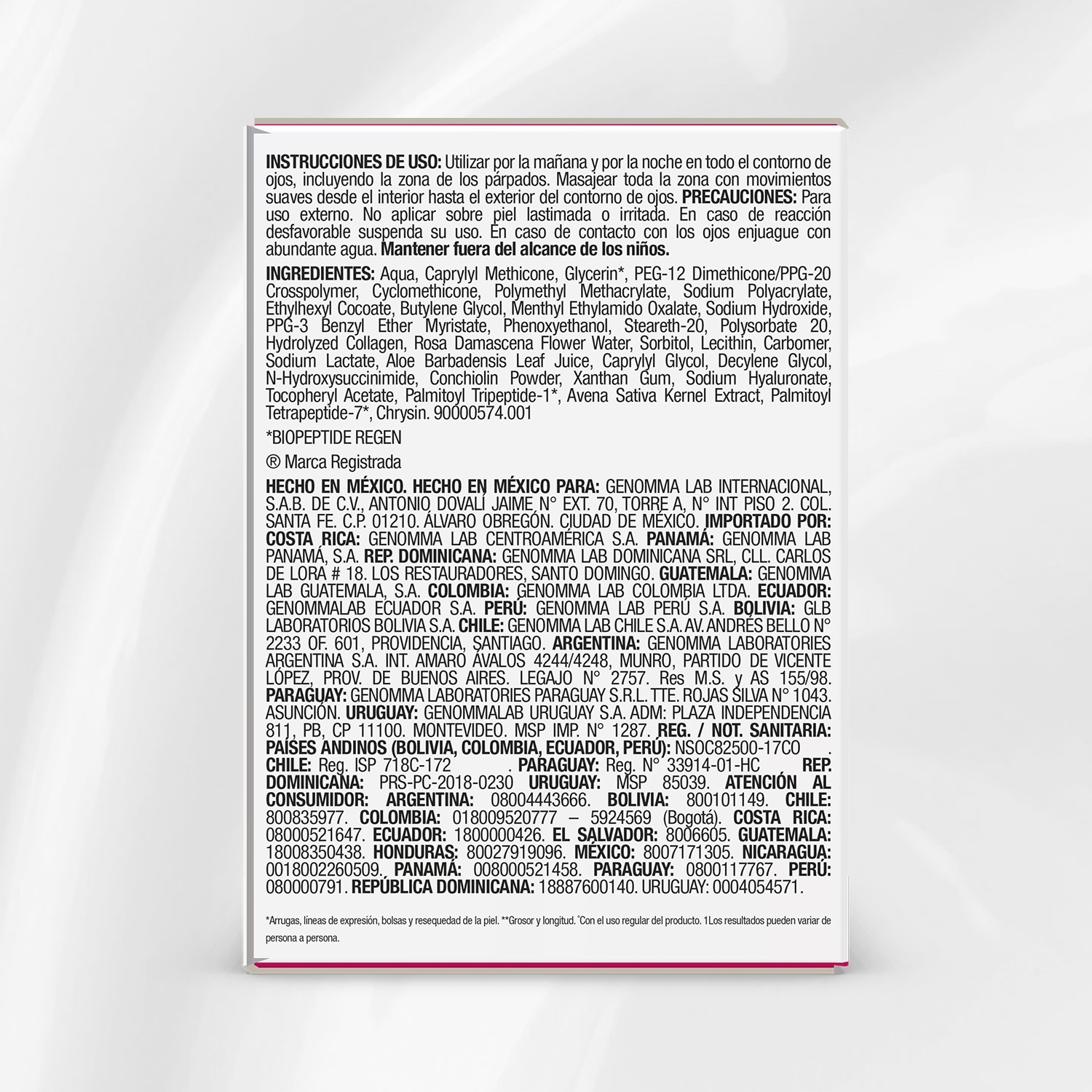Es una crema para contorno de ojos, está especialmente formulada con Biopeptide Regen® ingredientes Soft Focus que difuminan signos de la edad en el CONTORNO DE OJOS en cada aplicación. Su efecto Blur ALISA el contorno y difumina signos de inmediato. Su Acción Filler: RELLENA ARRUGAS, líneas de expresión, BOLSAS, disminuye OJERAS y resequedad de la piel. Su fórmula HIPOALERGÉNICA posee una textura de crema gel no grasa, sin color ni aroma, brinda un efecto frío inmediato, que en solo 2 minutos disminuye la temperatura de la piel aportando frescura inmediata.