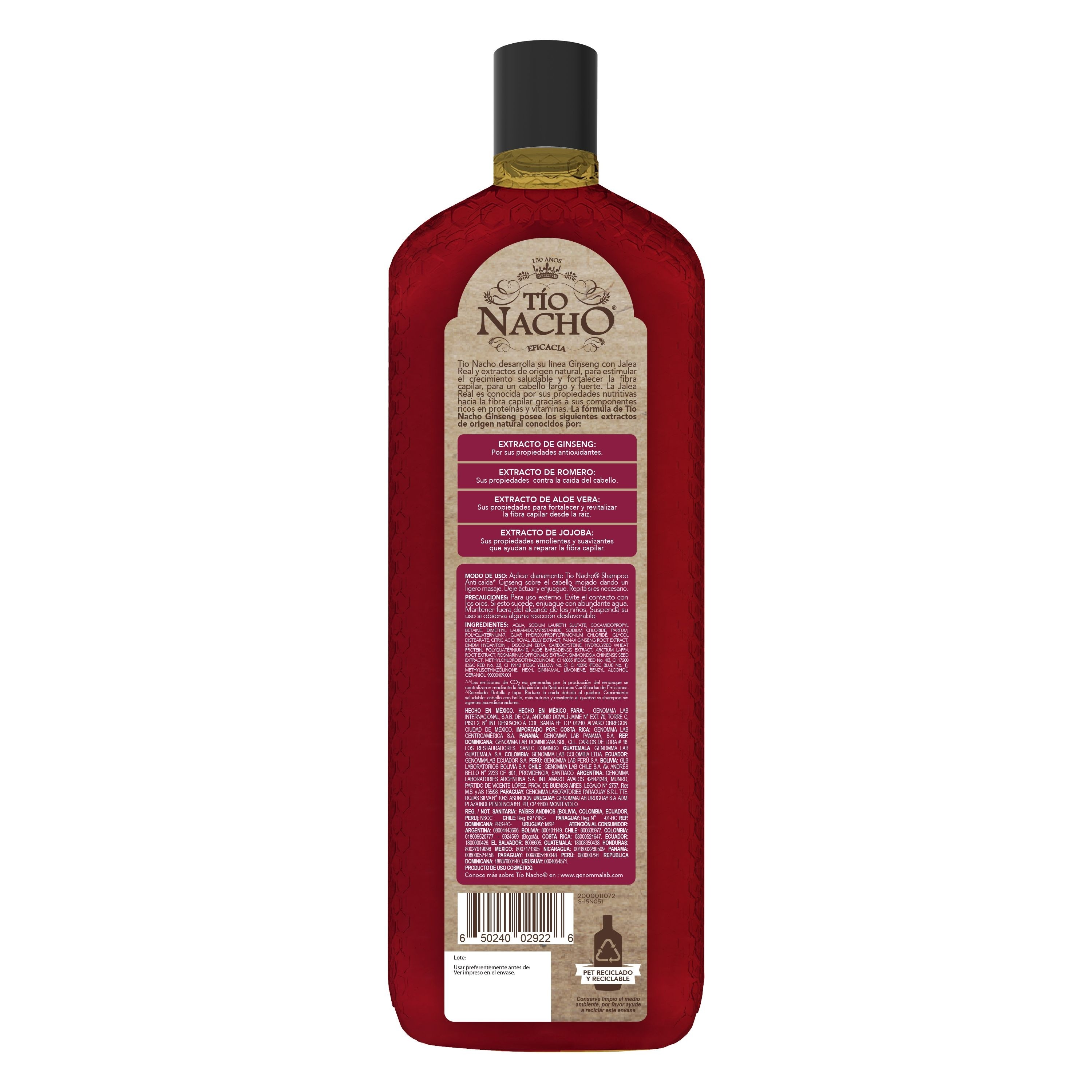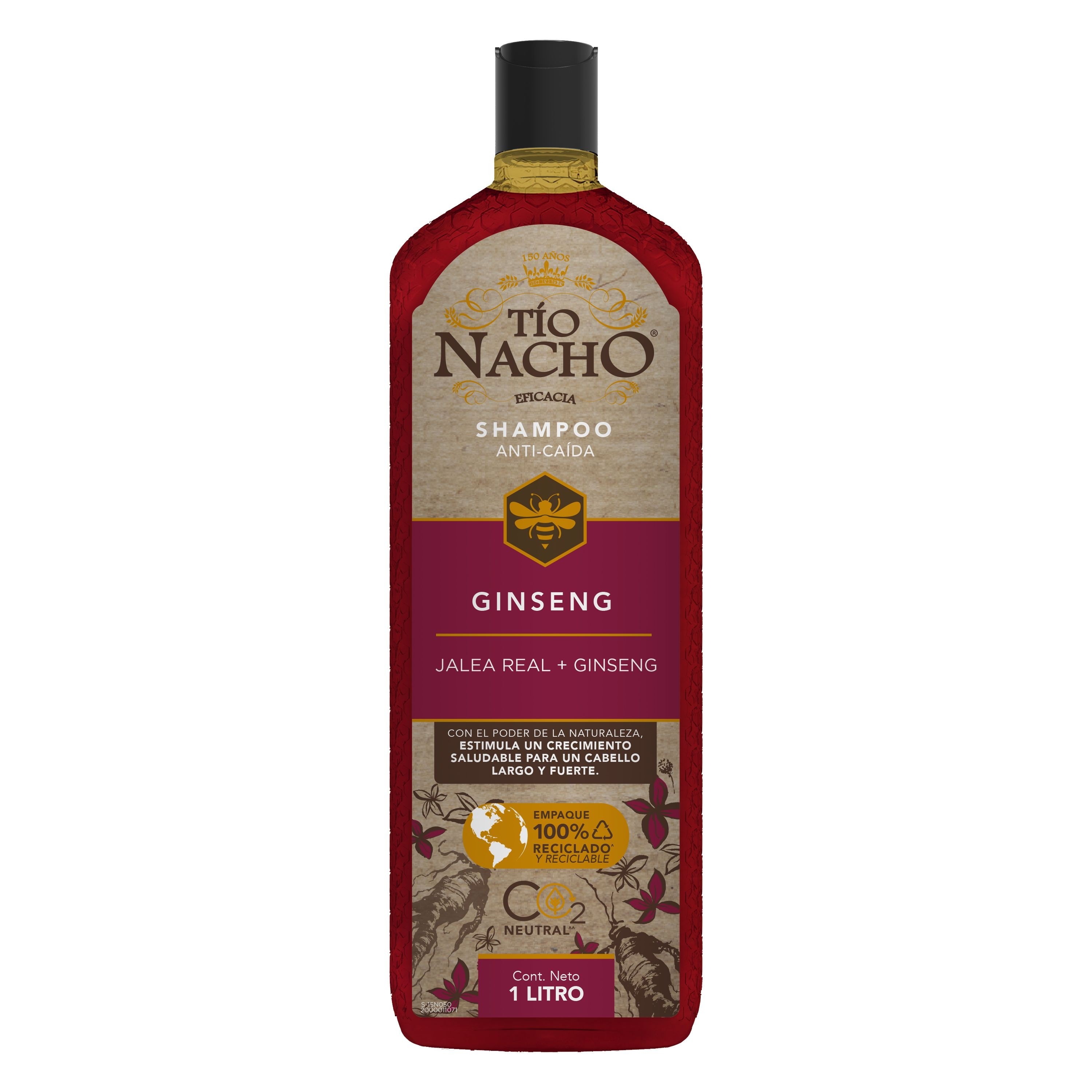 Tío Nacho renueva su imagen para brindarte un Cabello y Planeta más saludable. Tío Nacho ANTICAÍDA GINSENG revitaliza la fibra capilar para un CRECIMIENTO saludable, un cabello más LARGO y FUERTE, aún en situación de caída por quiebre, dejándolo con cuerpo y sedosidad. Actúa eficazmente sobre el cuero cabelludo y fibra capilar mientras su fórmula con JALEA REAL, adicionada con extractos de origen natural como GINSENG, ALOE VERA, ROMERO y JOJOBA estimulando el crecimiento saludable. Nuevo empaque 100% reciclado y reciclable.