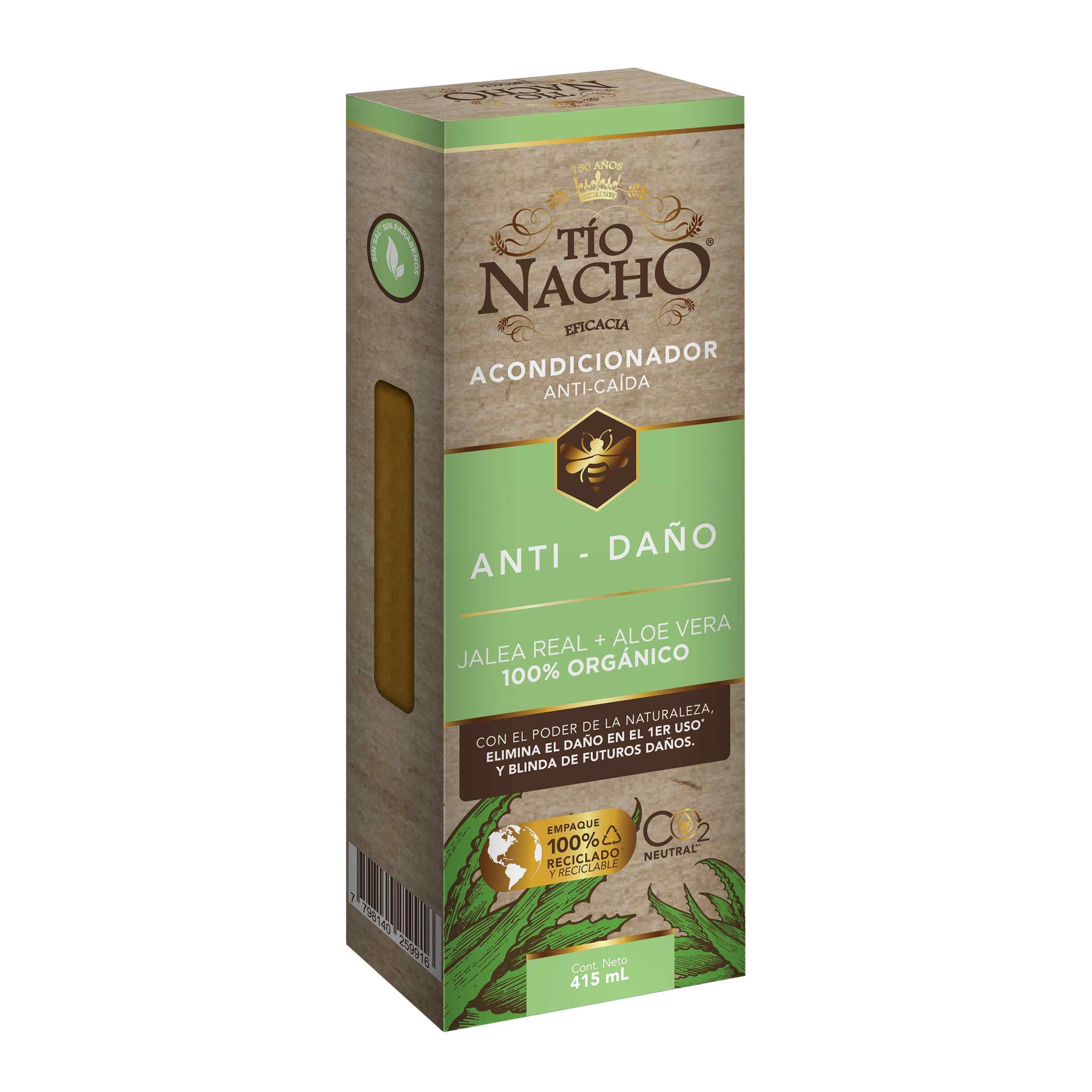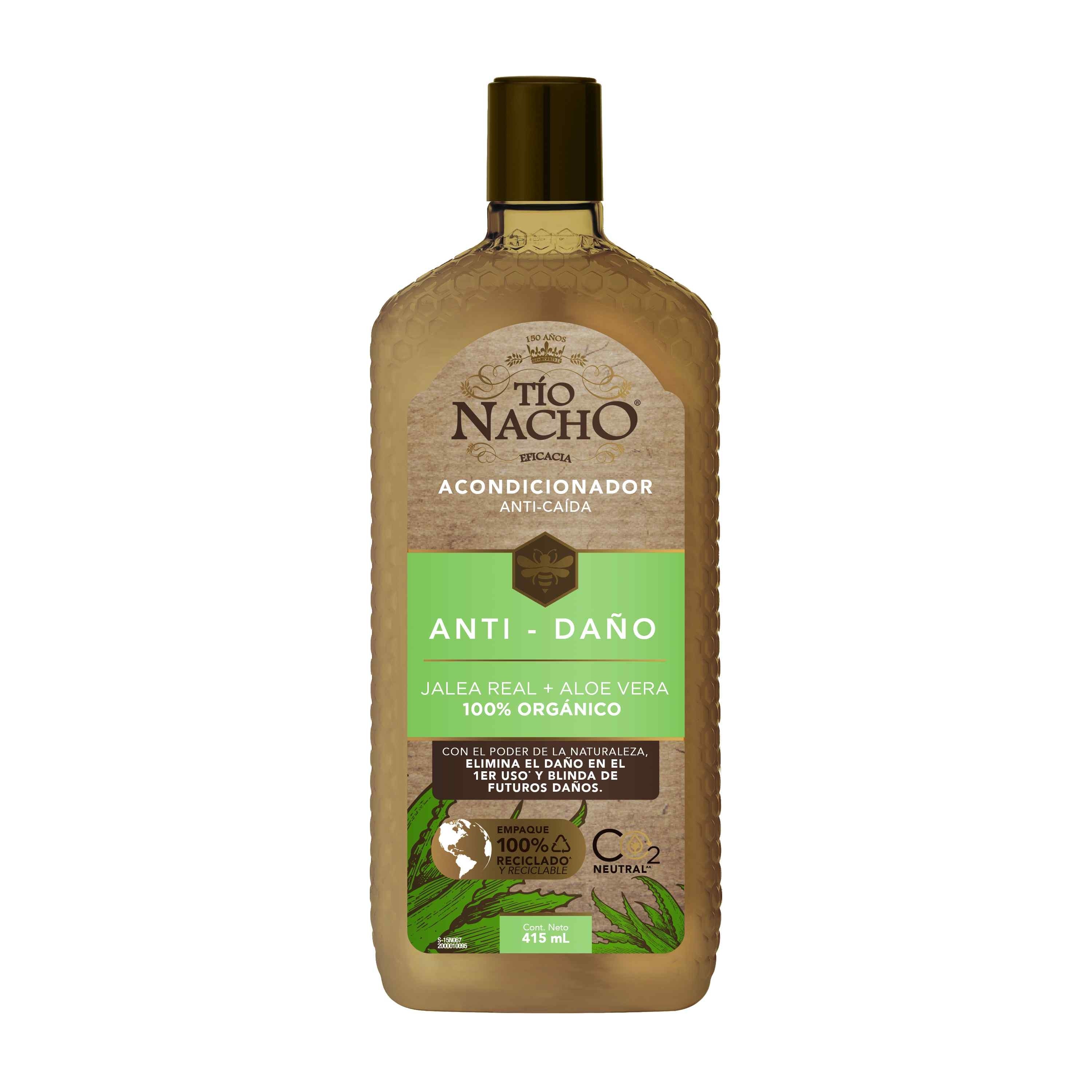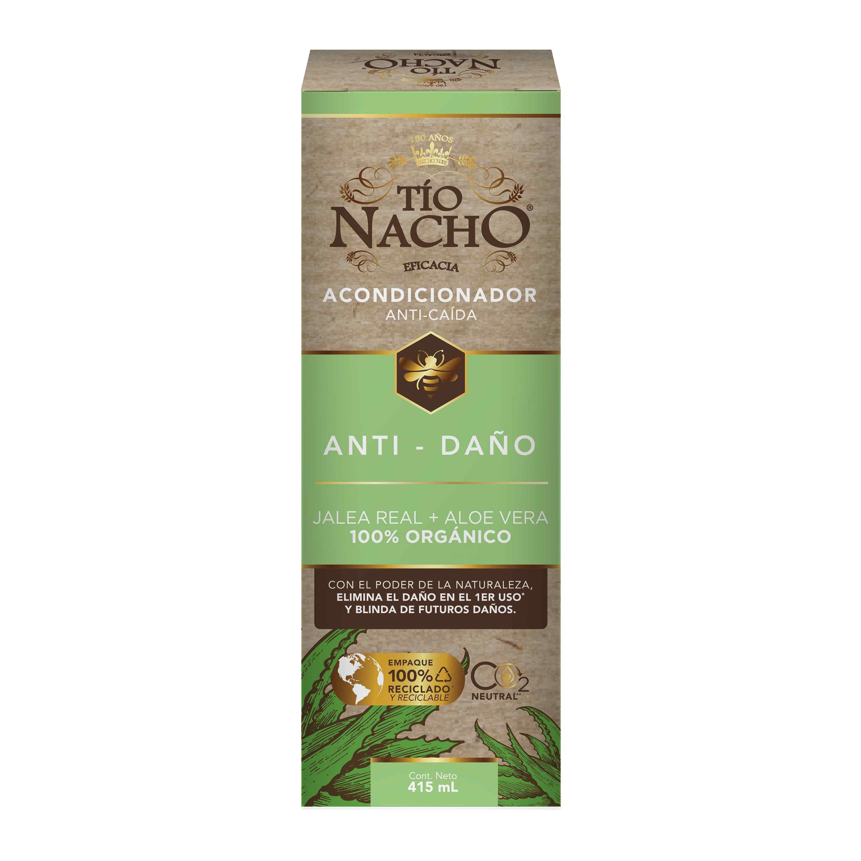 Tío Nacho renueva su imagen para brindarte un Cabello y Planeta más saludable. El Acondicionador Tío Nacho Anti-Daño ofrece un tratamiento de REPARACIÓN PROFUNDA para el CABELLO DAÑADO. Con extractos de origen natural como JALEA REAL + ALOE VERA 100% ORGÁNICO, conocido por sus propiedades REPARADORAS, que fortalecen la fibra capilar y KERATINA, VEGETAL que proporciona la SUAVIDAD, FUERZA Y BRILLO a tu cabello. Nuevo empaque 100% reciclado y reciclable.