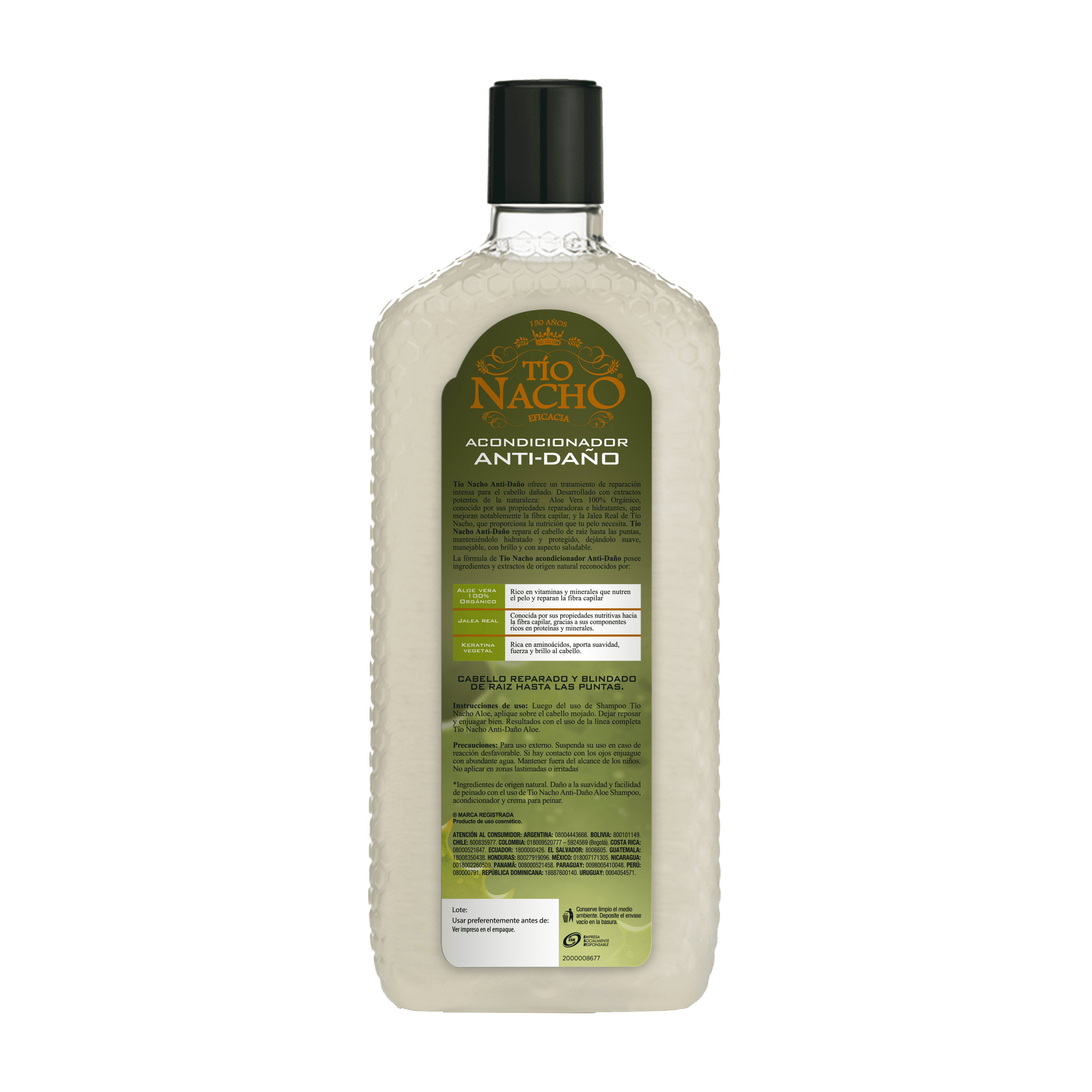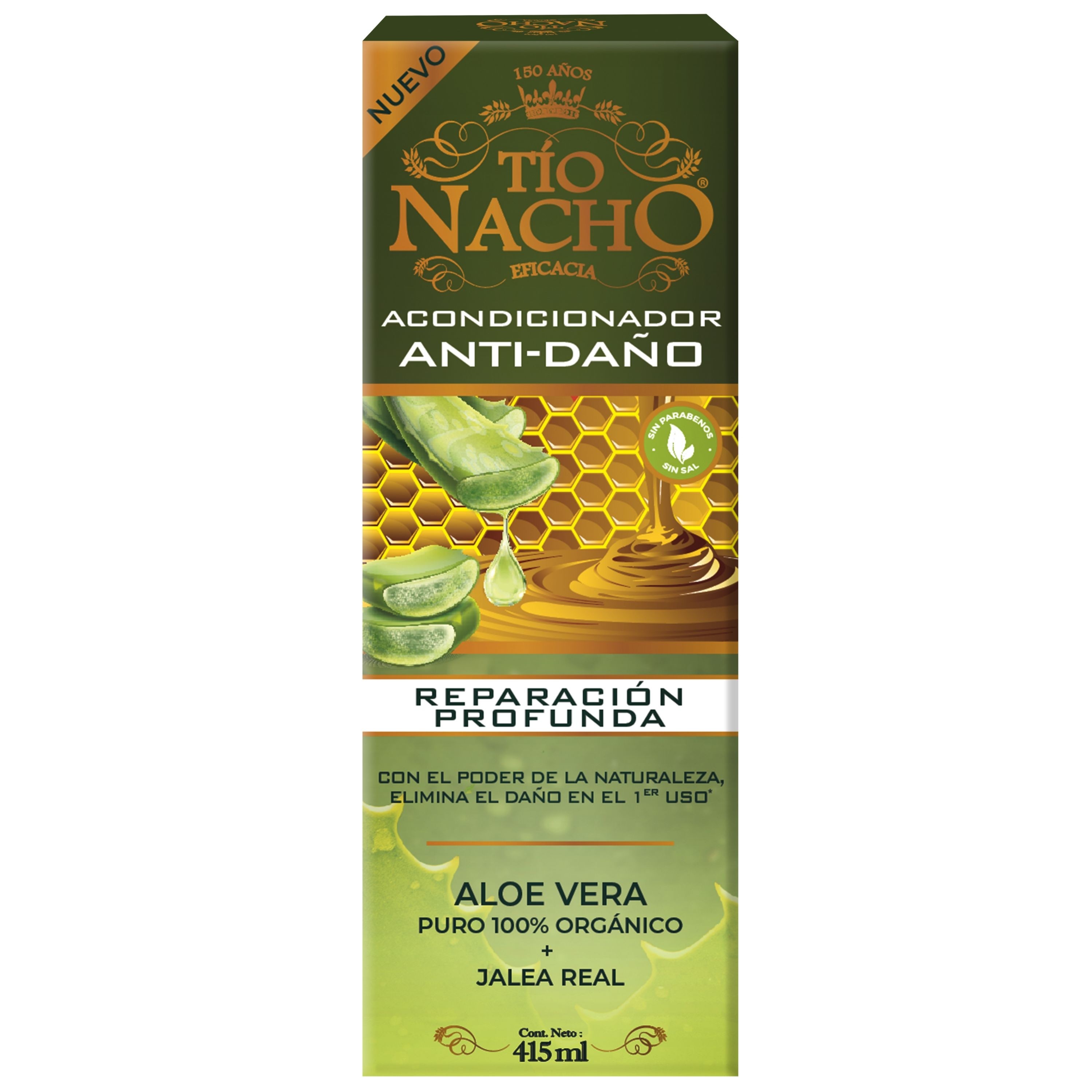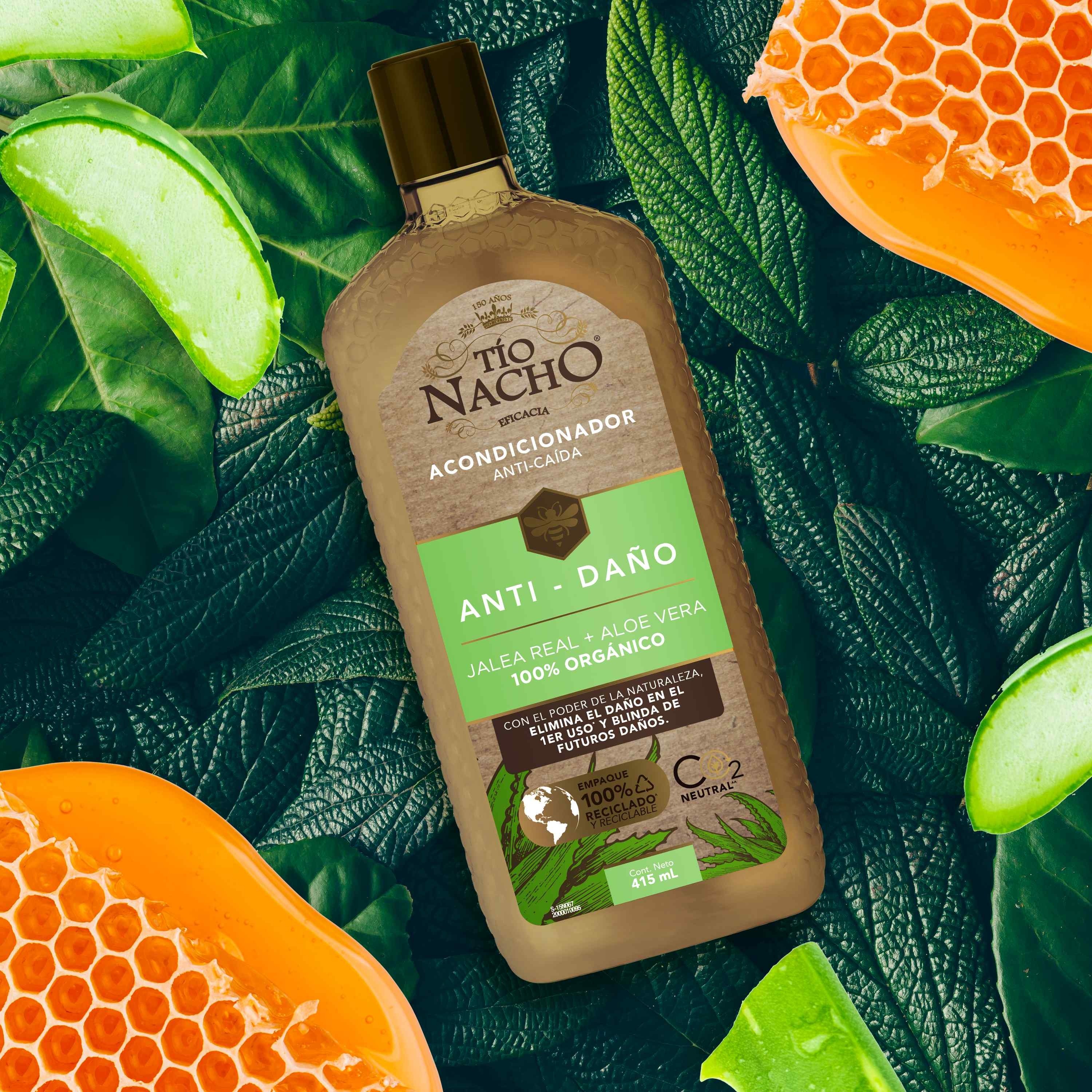 Tío Nacho renueva su imagen para brindarte un Cabello y Planeta más saludable. El Acondicionador Tío Nacho Anti-Daño ofrece un tratamiento de REPARACIÓN PROFUNDA para el CABELLO DAÑADO. Con extractos de origen natural como JALEA REAL + ALOE VERA 100% ORGÁNICO, conocido por sus propiedades REPARADORAS, que fortalecen la fibra capilar y KERATINA, VEGETAL que proporciona la SUAVIDAD, FUERZA Y BRILLO a tu cabello. Nuevo empaque 100% reciclado y reciclable.