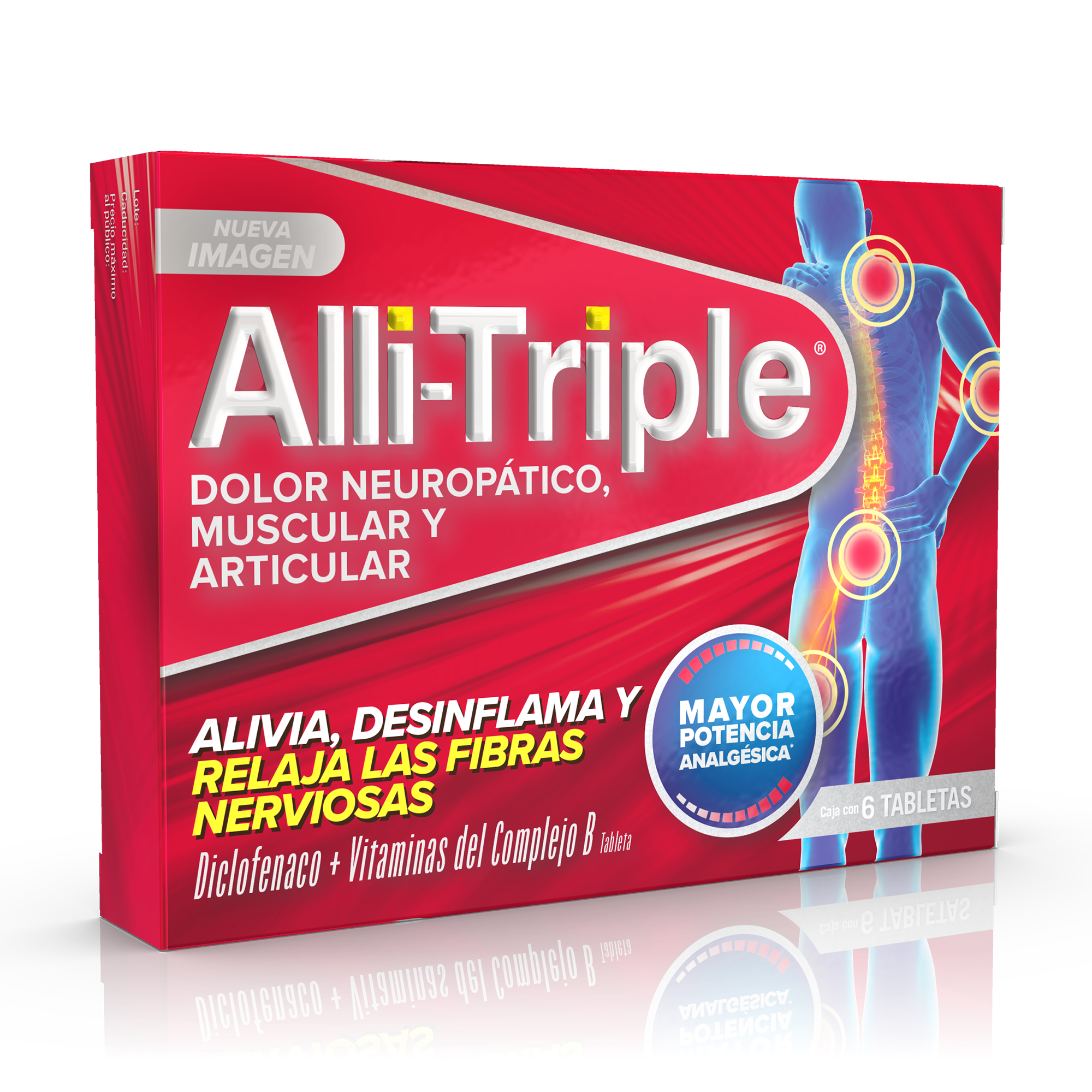 Allitriple esta indicado para el alivio del dolor e inflamación de músculos, articulaciones y de las fibras nerviosas del cuerpo. Dolores como dolor de ciática, dolor lumbar y dolor cervical. Por su combinación sinérgica con vitaminas del complejo B Allitriple ofrece mayor potencia analgésica y antiinflamatoria. Allitriple contiene diclofenaco sódico más vitaminas del Complejo B (B1, B6 y B12).