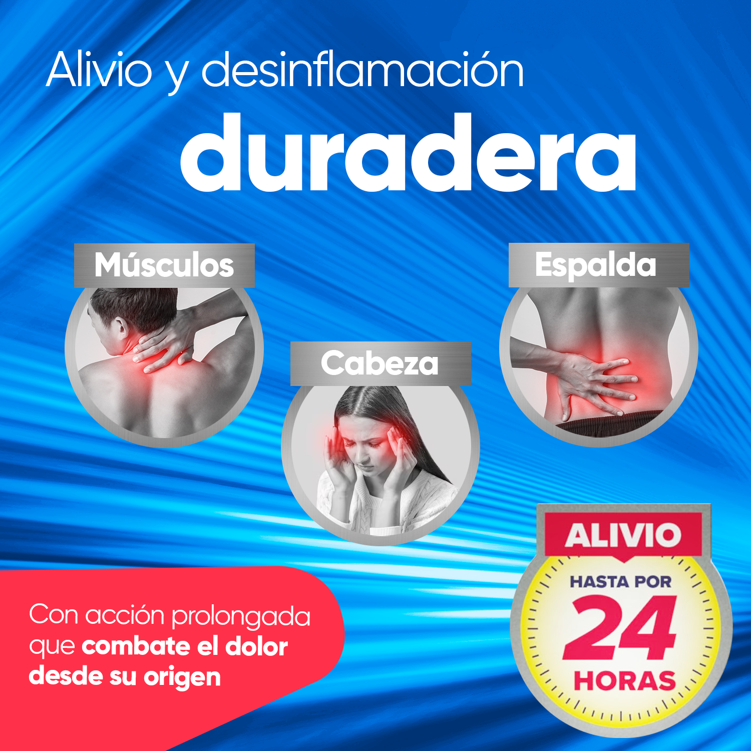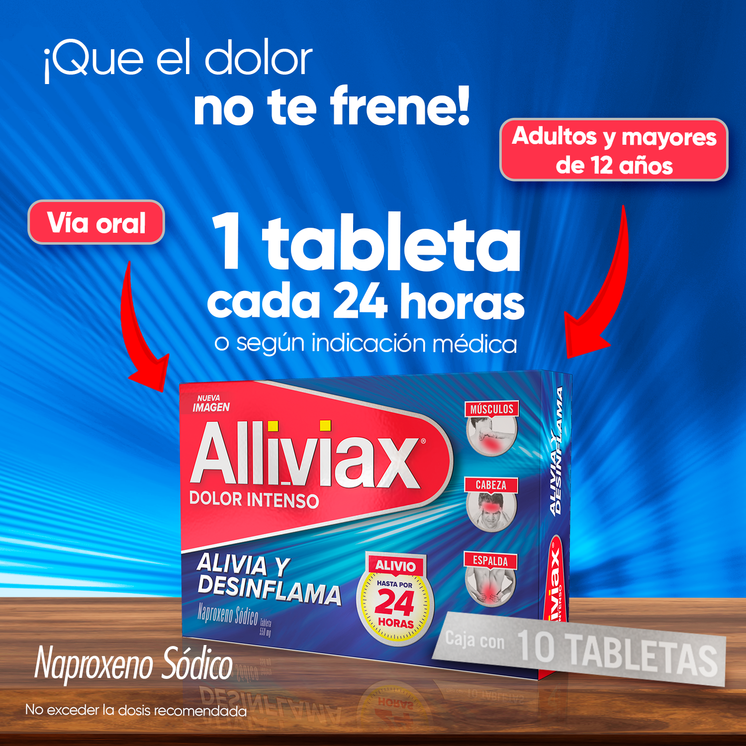 Alivia y desinflama varios tipos de dolores: muscular, espalda, cabeza, garganta, cuello, cólicos. La fórmula de Alliviax contiene Naproxeno Sódico que actúa hasta por 24 horas. Alliviax alivia el dolor intenso. Alliviax es un medicamento que no requiere receta médica.