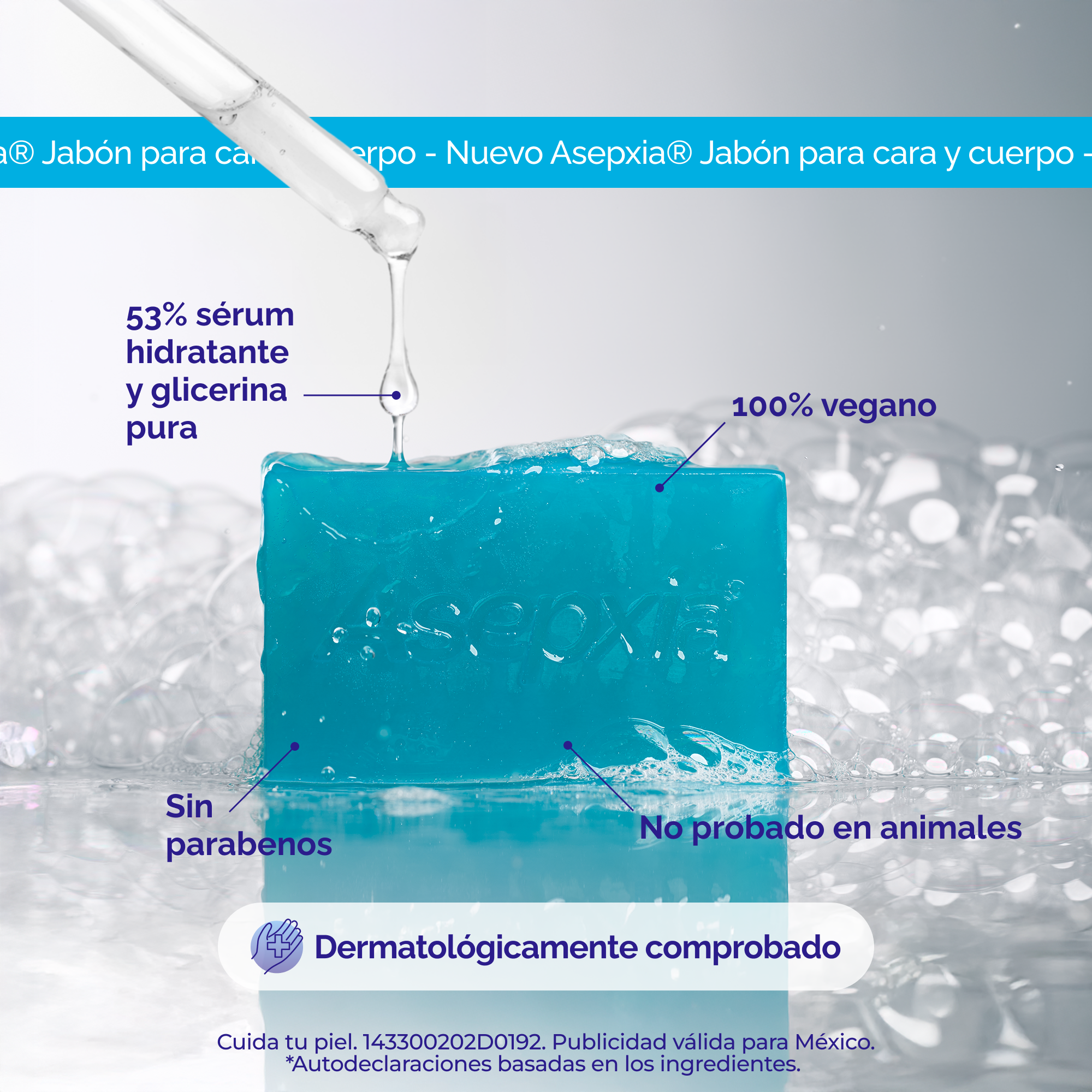 Asepxia Jabón Regenerador con 53% sérum hidratante. Elimina células muertas y no reseca. Cara y cuerpo, 100 g.