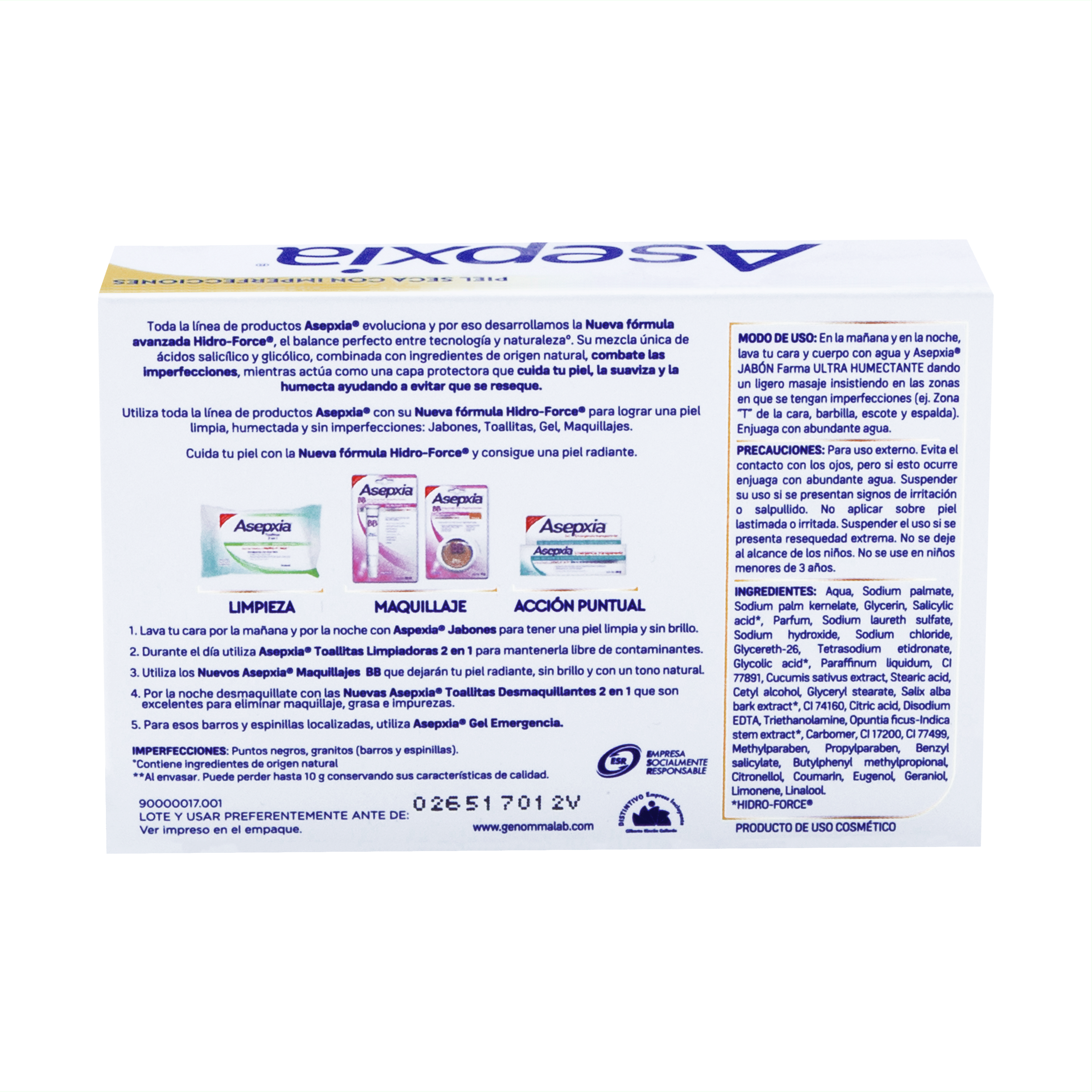 En la mañana y en la noche, lava tu cara y cuerpo con agua y Asepxia® Jabones, dando un ligero masaje, especialmente, en las zonas con imperfecciones (zona T de la cara, barbilla, escote y espalda). Enjuaga con abundante agua.