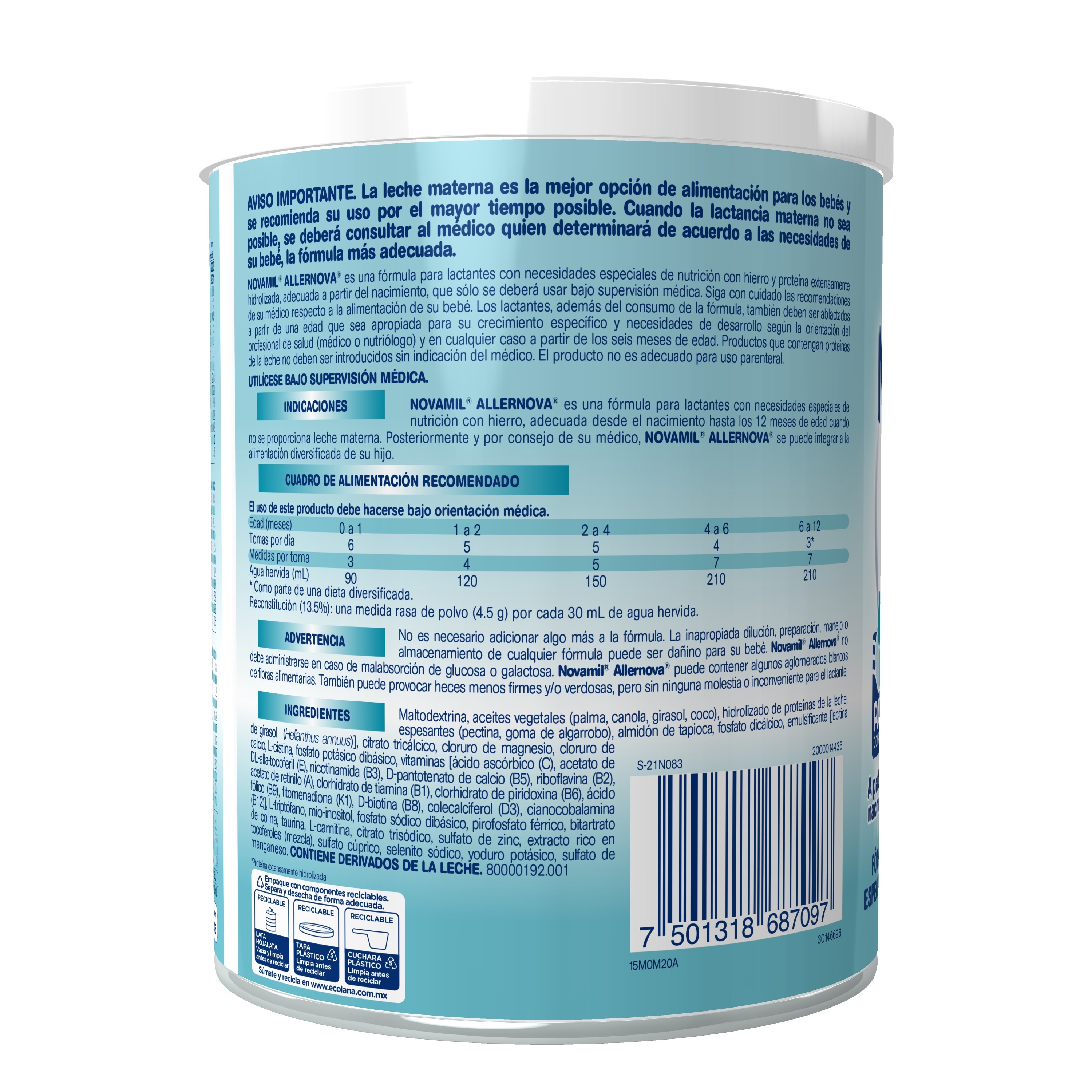 Productos que contengan proteínas de la leche no deben ser introducidos sin indicación del médico. El producto no es adecuado para uso parenteral. No es necesario adicionar algo más a la fórmula. La inapropiada dilución, preparación, manejo o almacenamiento de cualquier fórmula puede ser dañino para su bebé. Novamil® Allernova® no debe administrarse en caso de malabsorción de glucosa o galactosa. Novamil® Allernova® puede contener algunos aglomerados blancos de fibras alimentarias. También puede provocar heces menos firmes y/o verdosas, pero sin ninguna molestia o inconveniente para el lactante.