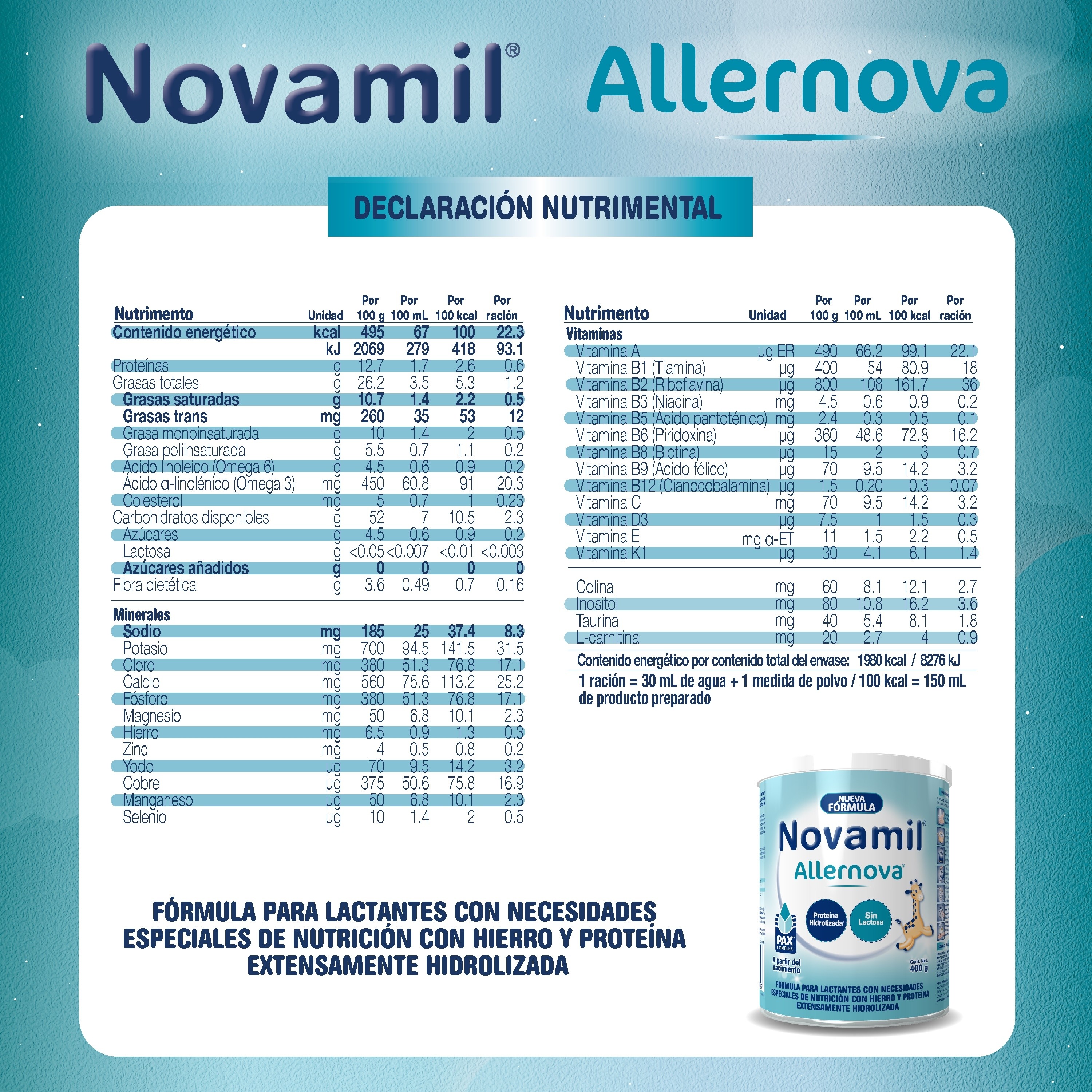 La que indique su médico de acuerdo a edad y necesidad de cada bebé. Adicional lea las instrucciones de la lata. 1. Enjuague perfectamente y después esterilice los recipientes y todos sus accesorios. 2. De acuerdo a las instrucciones del profesional de la salud o al cuadro de alimentación recomendado, preparar con agua hervida por 5 minutos y enfriada hasta que quede tibia. En caso de no contar con ésta se podrá utilizar agua purificada a temperatura ambiente. 3. Primero sirva la cantidad necesaria de agua en el recipiente. 4. Añada el número necesario de medidas al ras no comprimidas, utilizando el medidor que se incluye en la lata y el lomo de un cuchillo limpio y seco para nivelar cada medida al ras. 5. Cierre el recipiente y agite bien hasta la completa disolución del polvo. 6. Pruebe la temperatura dejando caer unas gotas en el dorso de la mano. El producto debe estar tibio. Utilícelo inmediatamente. NOVAMIL® ALLERNOVA® es una fórmula para lactantes con necesidades especiales de nutrición espesa. Se deberá usar un chupón de flujo rápido. Debido a su composición específica tiene un sabor y olor que pueden diferir al de otras fórmulas lácteas estándar. No se debe calentar usando horno de microondas. No preparar con anticipación sino siempre justo antes de alimentar al bebé. El producto preparado debe ingerirse en la hora siguiente a su preparación. Deseche el sobrante no terminado.
