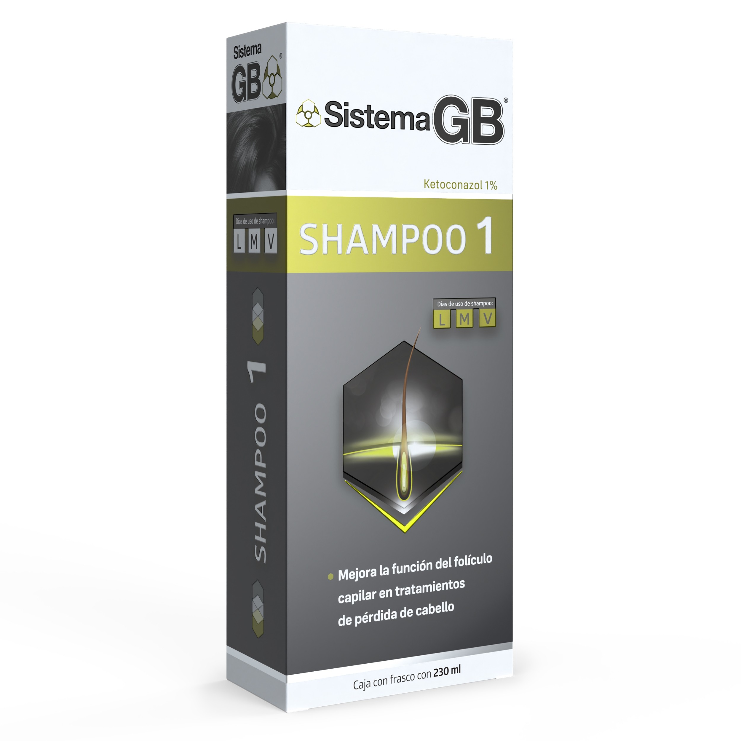 SISTEMA GB Shampoo 1 contiene KETOCONAZOL, activo que, debido a sus propiedades, MEJORA LA ACCIÓN de algunos TRATAMIENTOS para la ALOPECIA hereditaria (pérdida de cabello) usándolo como tratamiento a largo plazo (3 a 5 meses).