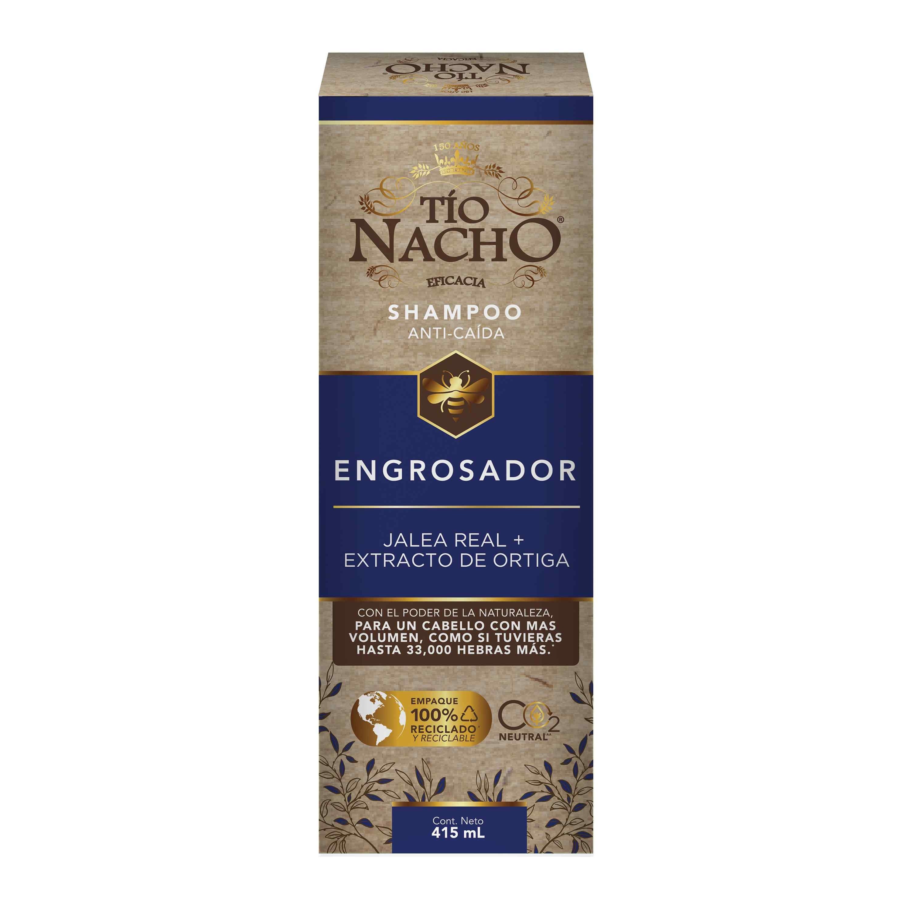 Tío Nacho renueva su imagen para brindarte un Cabello y Planeta más saludable. ¿Cansado de tener un cabello quebradizo y sin volumen? Prueba TÍO NACHO ENGROSADOR, la combinación perfecta de JALEA REAL con ingredientes de origen natural, como extracto de ORTIGA, GINSENG, QUINA, ALOE VERA y LÚPULO que ENGROSAN y FORTALECEN cada fibra capilar. Siente tu cabello MÁS FUERTE y con MÁS VOLUMEN. Nuevo empaque 100% reciclado y reciclable.