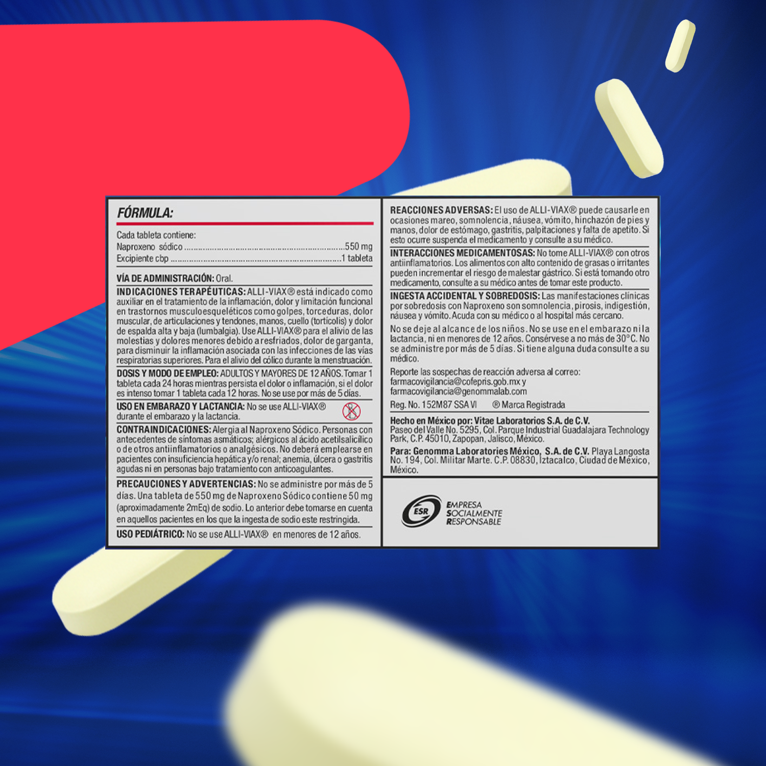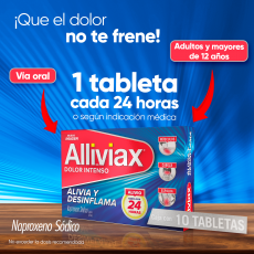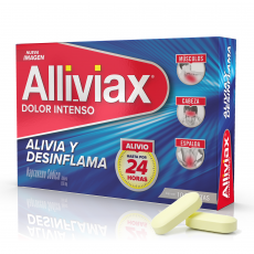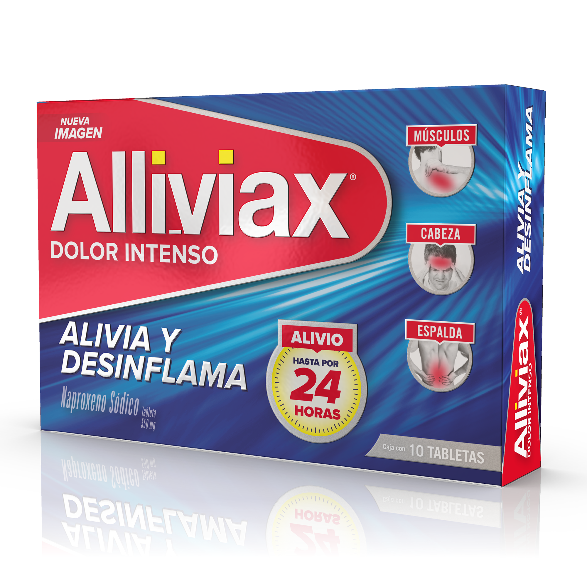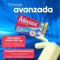 Alliviax 550 mg es una tableta auxiliar en el TRATAMIENTO por INFLAMACIÓN Y DOLOR. Alivia varios tipos de dolores como MUSCULAR, dolores de ESPALDA, de GARGANTA, de CUELLO y CÓLICOS durante la menstruación. La fórmula de Alliviax contiene Naproxeno Sódico que actúa hasta por 12 horas. Otros dolores que también alivia son los ocasionado por golpes, torceduras, contracturas, así como dolor de muelas, dolores menores y molestias así como fiebre causada por resfriados. Alliviax es un medicamento que no requiere receta médica.
