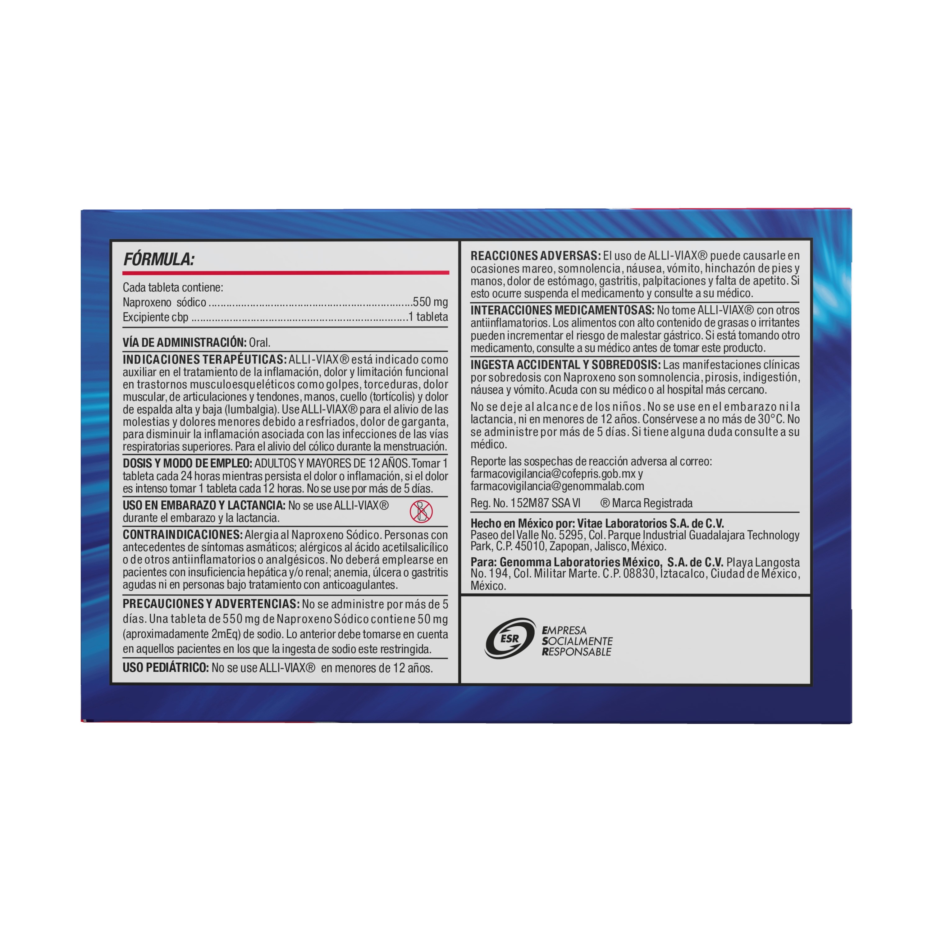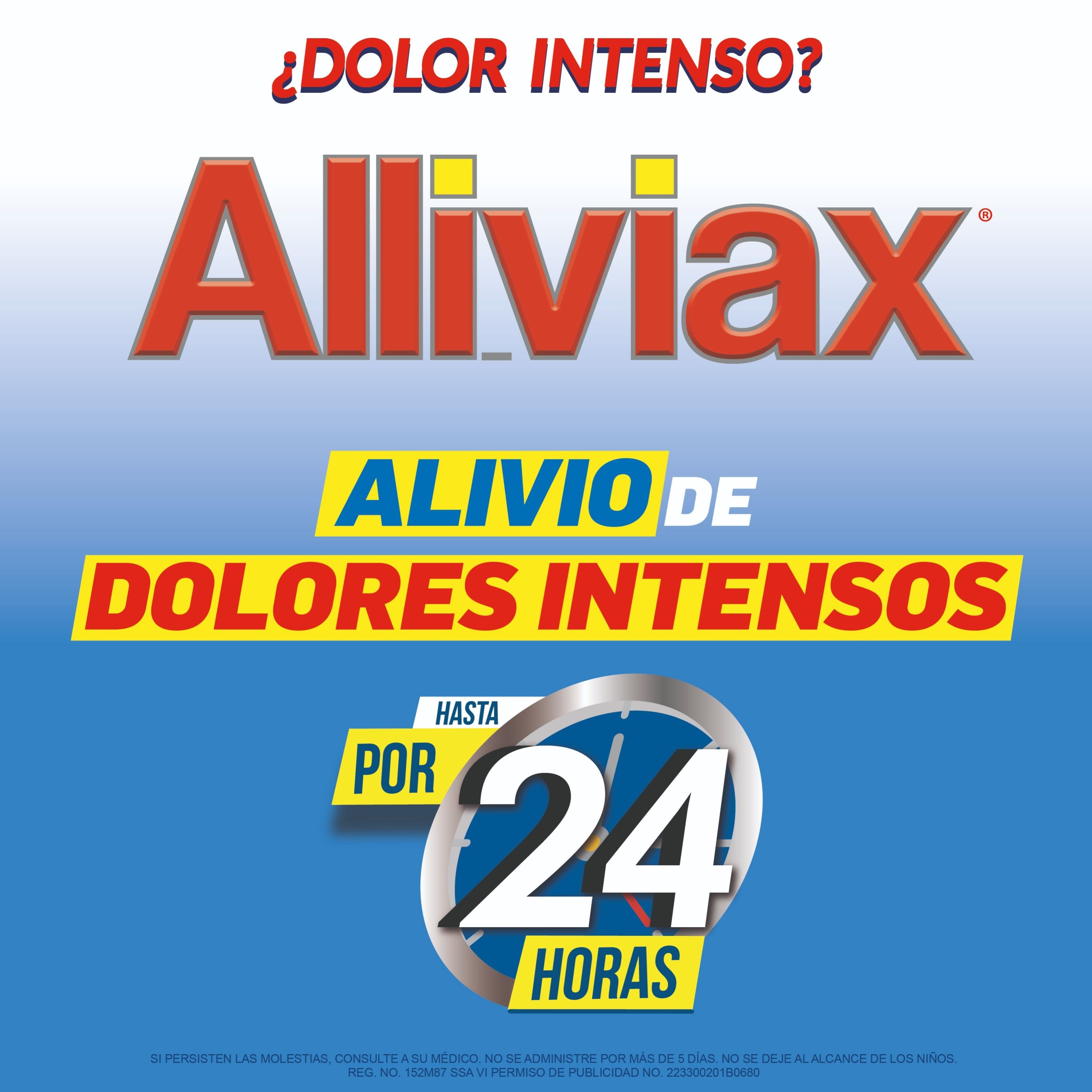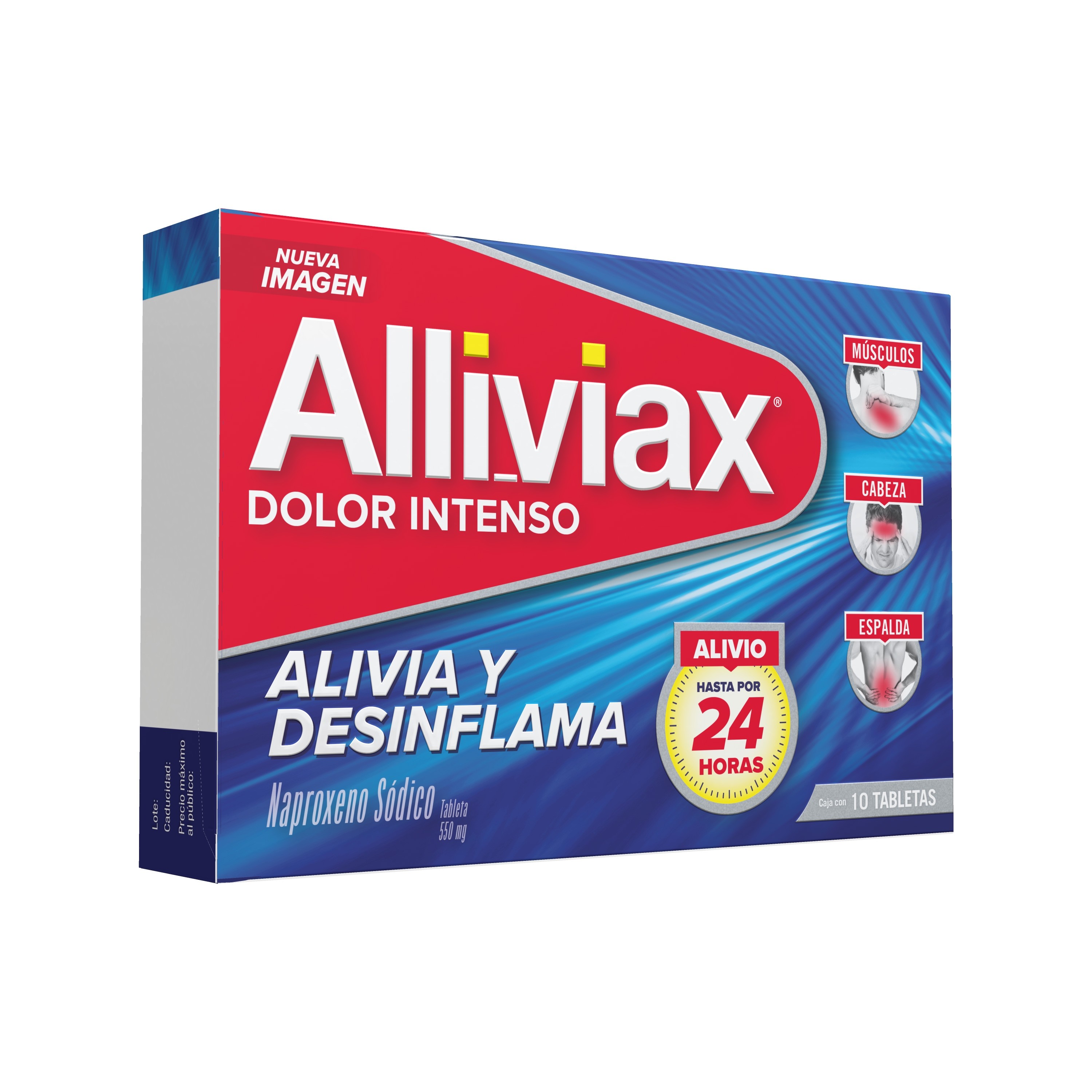 Alliviax 550 mg es una tableta auxiliar en el TRATAMIENTO por INFLAMACIÓN Y DOLOR. Alivia varios tipos de dolores como MUSCULAR, dolores de ESPALDA, de GARGANTA, de CUELLO y CÓLICOS durante la menstruación. La fórmula de Alliviax contiene Naproxeno Sódico que actúa hasta por 12 horas. Otros dolores que también alivia son los ocasionado por golpes, torceduras, contracturas, así como dolor de muelas, dolores menores y molestias así como fiebre causada por resfriados. Alliviax es un medicamento que no requiere receta médica.