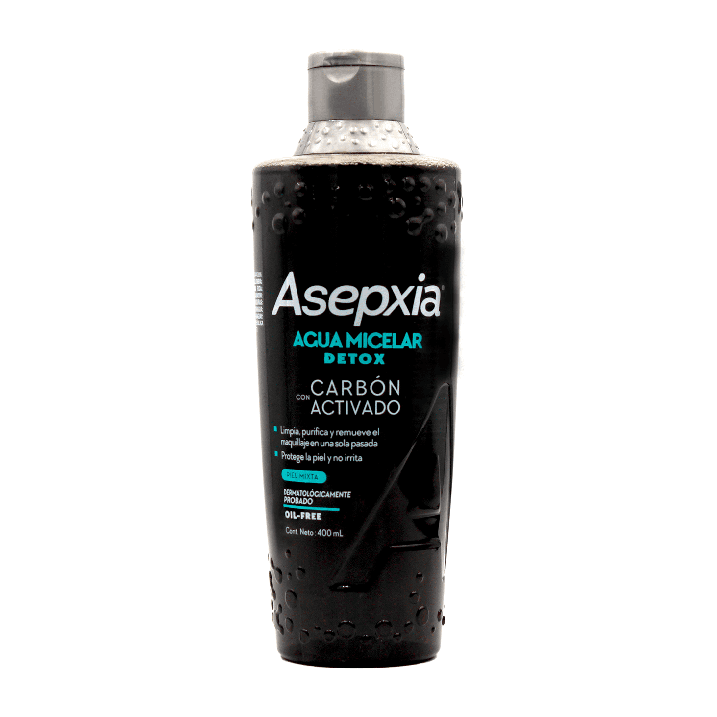 Nueva Asepxia AGUA MICELAR Carbón Detox Ideal para pieles MIXTAS. Con CARBÓN ACTIVADO y MICELAS que proporcionan un EFECTO DETOX*, purificando los poros y limpiando no solo el maquillaje sino la grasa de la piel. LIMPIA, PURIFICA y REMUEVE el MAQUILLAJE e IMPUREZAS**. Remueve el maquillaje en una sola pasada. Asepxia Agua Micelar Carbón Detox es LIBRE DE ACEITES. Contiene ingredientes de origen natural que protegen tu piel y no la irritan. Sin necesidad de enjuague. No deja residuos. Probado dermatológicamente. *Remueve agentes toxicos del ambiente que se depositan en la piel. **Impurezas: Contaminación y suciedad que se depositan en la piel.