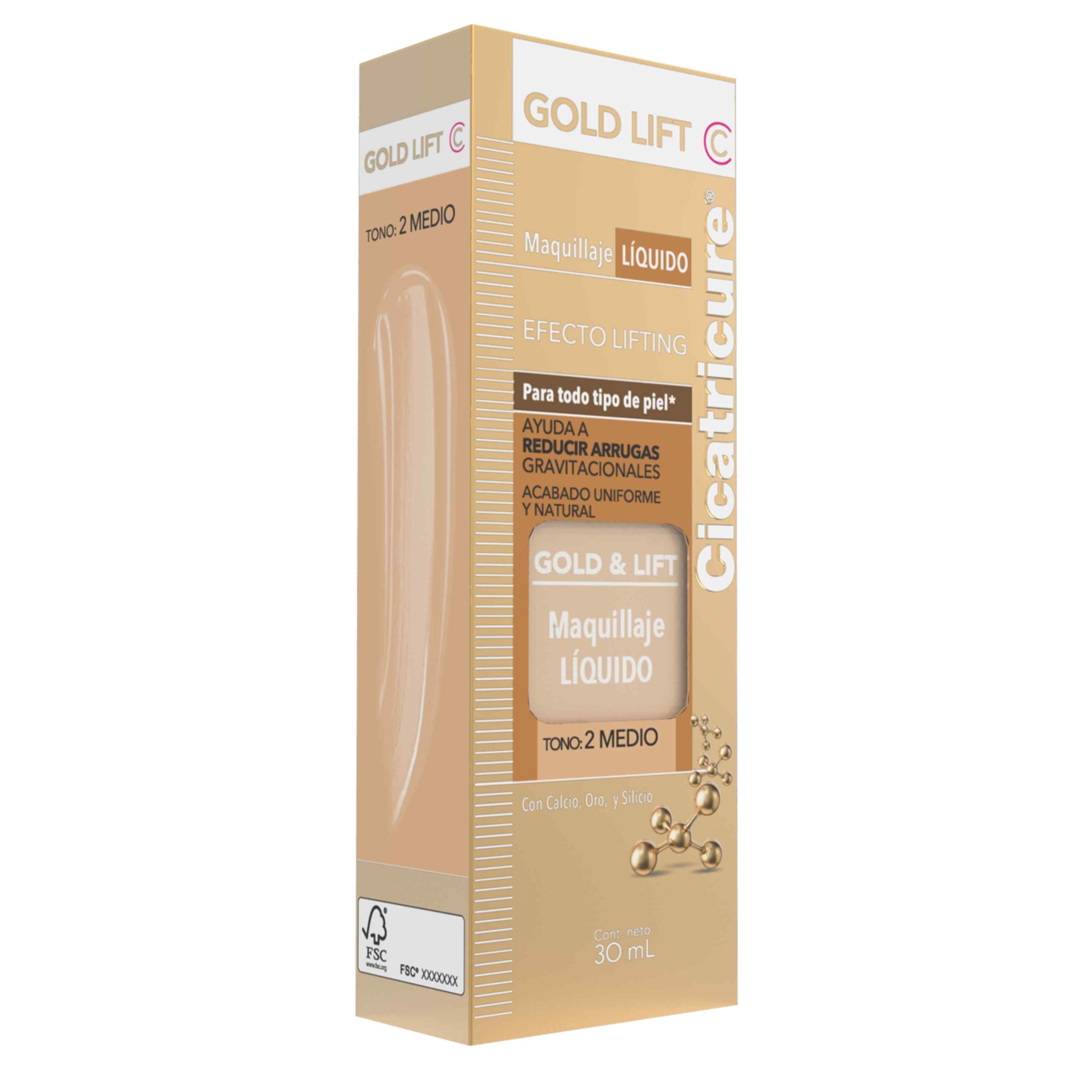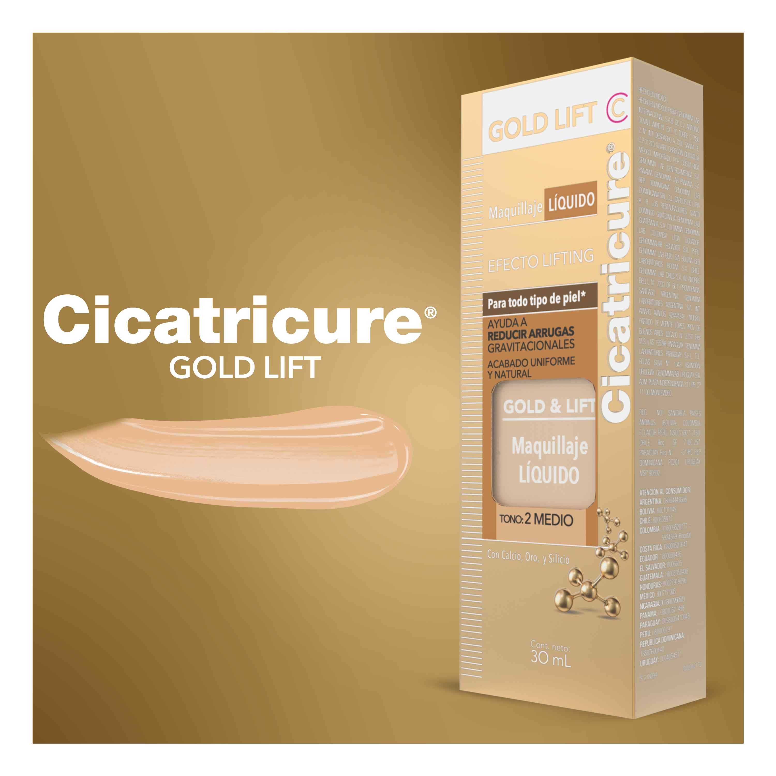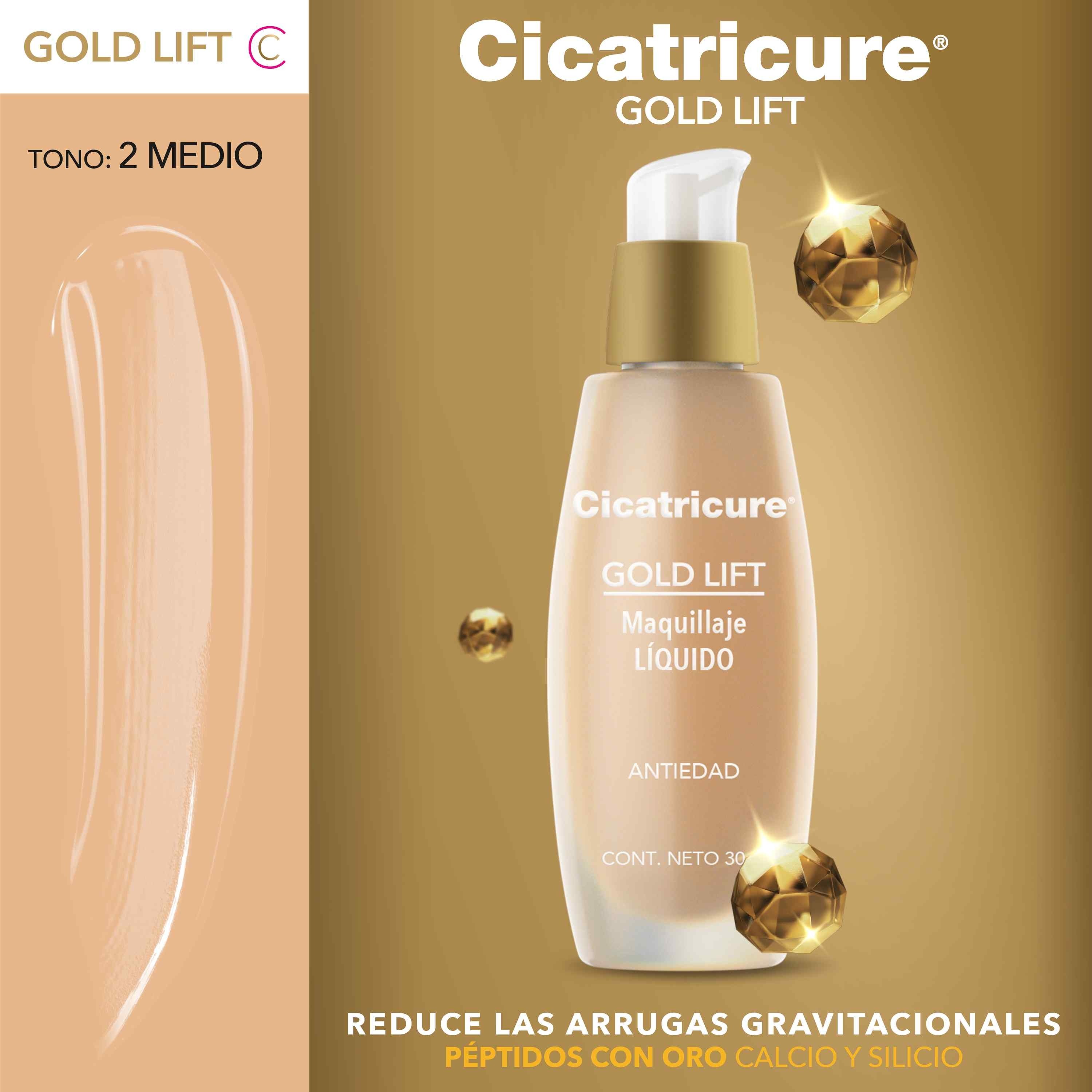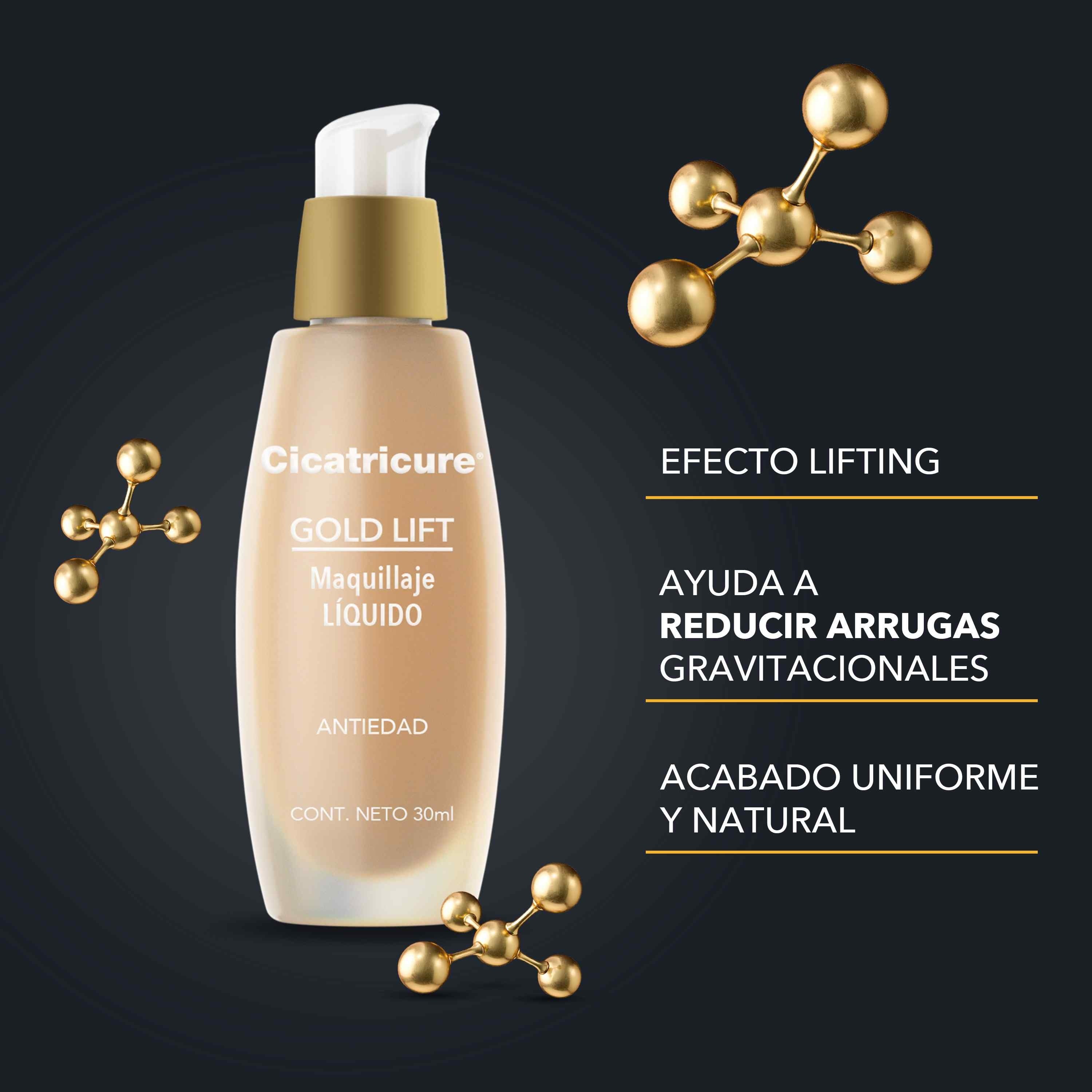 Cicatricure Gold Lift Maquillaje Líquido, la primera base de maquillaje en tratar arrugas gravitacionales. Su exclusiva fórmula combina Péptidos con Oro, Calcio y Silicio, generando un efecto lifting, a la vez que cubre uniformemente la piel. De textura flexible, logra un