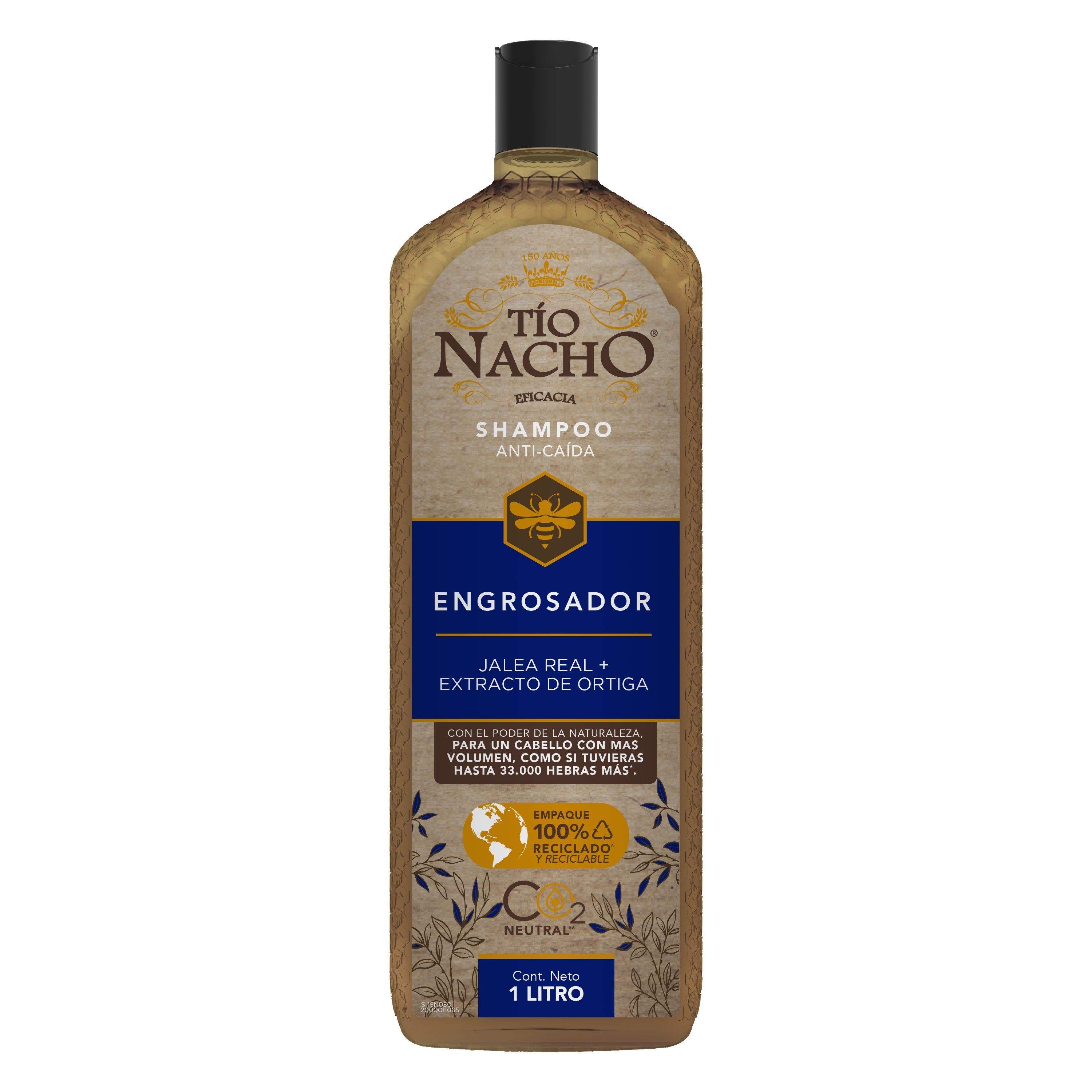 Tío Nacho renueva su imagen para brindarte un Cabello y Planeta más saludable. ¿Cansado de tener un cabello quebradizo y sin volumen? Prueba TÍO NACHO ENGROSADOR, la combinación perfecta de JALEA REAL con ingredientes de origen natural, como extracto de ORTIGA, GINSENG, QUINA, ALOE VERA y LÚPULO que ENGROSAN y FORTALECEN cada fibra capilar. Siente tu cabello MÁS FUERTE y con MÁS VOLUMEN. Nuevo empaque 100% reciclado y reciclable.