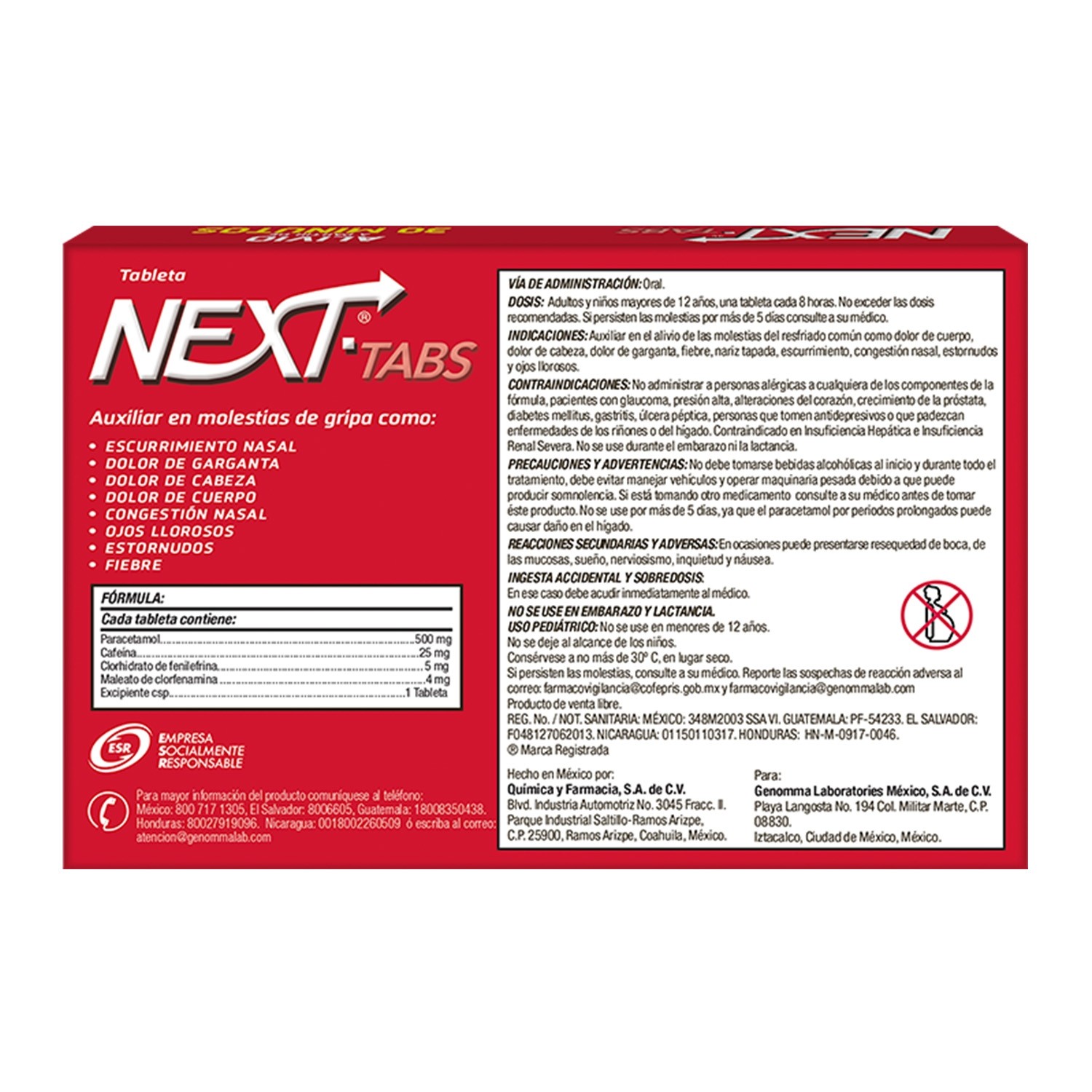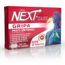 Next es un ANTIGRIPAL en presentación de tabletas que empieza a aliviar de los SÍNTOMAS como: escurrimiento y congestión nasal, cuerpo cortado, dolor de cabeza, dolor de garganta, fiebre, nariz tapada, estornudos y ojos llorosos; a partir de 30 MINUTOS, gracias a que tiene una fórmula de 4 ACTIVOS: Paracetamol, Clorfenamina, Cafeína, Fenilefrina. A los SÍNTOMAS de la GRIPA diles NEXT.