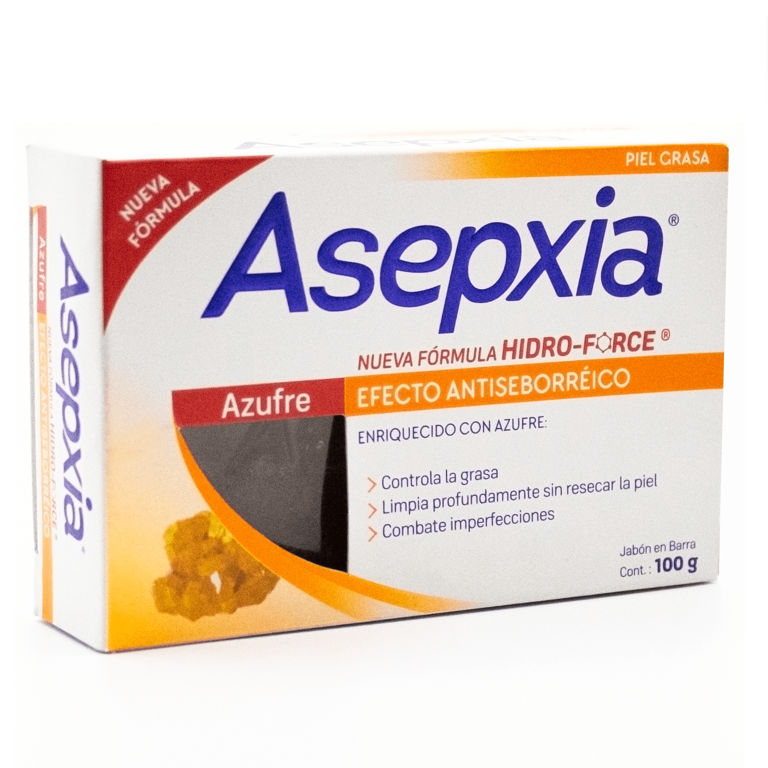 Asepxia presenta la fórmula más especializada contra imperfecciones: Asepxia Jabon Azufre. Su nueva fórmula HIDRO-FORCE® enriquecida con AZUFRE, CONTROLA la GRASA, LIMPIA profundamente SIN RESECAR la piel y combate imperfecciones desde el primer día de uso. Nueva fórmula avanzada HIDRO-FORCE, una mezcla única de ácidos salicílico y glicólico combinado con extractos naturales que COMBATEN PROFUNDAMENTE las imperfecciones. Además cuida tu piel creando una capa protectora que la HUMECTA, SUAVIZA y evita la resequedad e irritación. Utiliza toda la línea de productos Asepxia con su nueva fórmula Hidro-force para lograr una piel limpia, humectada y sin imperfecciones.