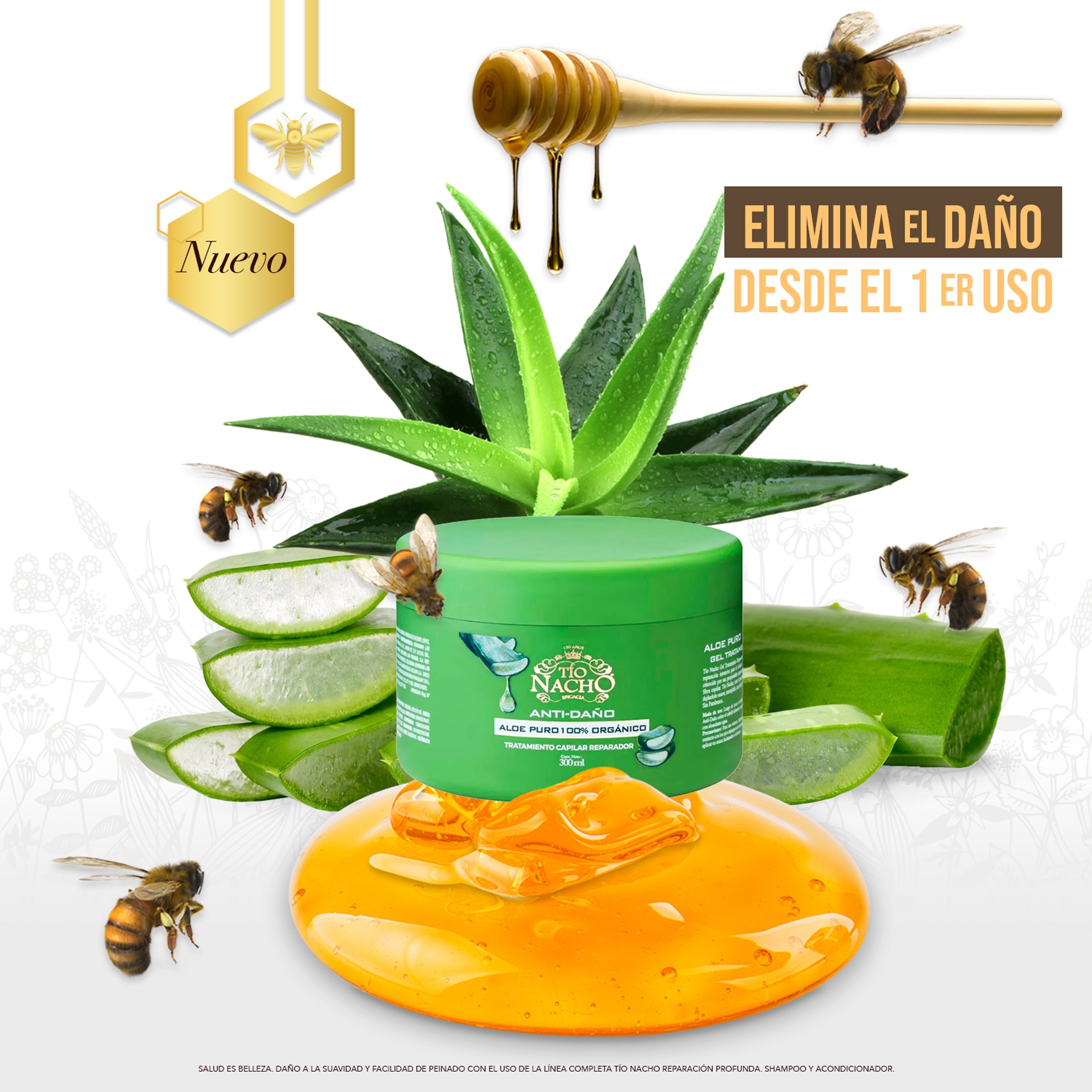 Tío Nacho TRATAMIENTO Reparador Anti-Daño, es un tratamiento concentrado de REPARACIÓN INTENSIVA para el CABELLO DAÑADO, con ALOE VERA puro 100% orgánico, conocido por sus propiedades REPARADORAS e HIDRATANTES, que mejoran notablemente la FIBRA CAPILAR. Tío nacho, con el poder de la naturaleza*, repara y protege tu cabello, dejándolo suave, manejable, con brillo y con aspecto saludable. Contiene KERATINA vegetal y JALEA REAL. Sin parabenos